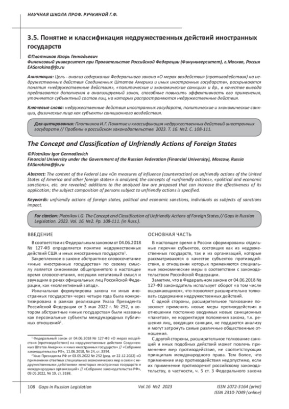 В соответствии с Федеральным законом от 04.06.2018 № 127-ФЗ определяется понятие недружественных действий США и иных иностранных государств1. Закрепленное в законе абстрактное словосочетание «иные иностранные государства» по своему смыслу является синонимом общепринятого в настоящее время словосочетания, несущим негативный смысл и звучащим в речах официальных лиц Российской Федерации, как «коллективный запад». Изначальная формулировка закона «и иных иностранных государств» через четыре года была конкретизирована в рамках реализации Указа Президента Российской Федерации от 3 мая 2022 г. № 252, в котором абстрактные «иные государства» были названы как персональные субъекты международных публичных отношений.