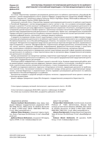 В данной научно-аналитической работе изучаются и анализируются существующие и перспективные решения в сфере правового регулирования майнинга криптовалют в иностранных государствах и Российской Федерации. В рамках научно-аналитического аспекта данной работы рассматриваются юридические и социально-экономические аспекты правового регулирования майнинга криптовалют в России, а также даётся характеристика существующему законопроекту, призванному выстроить систему законодательства вокруг деятельности по майнингу криптовалют.