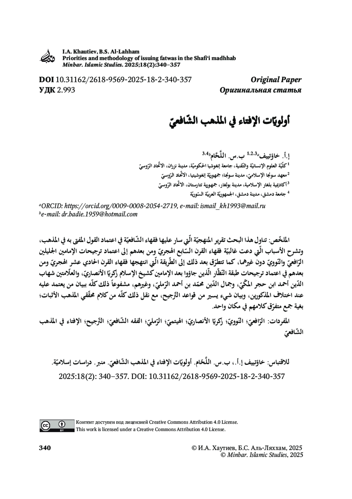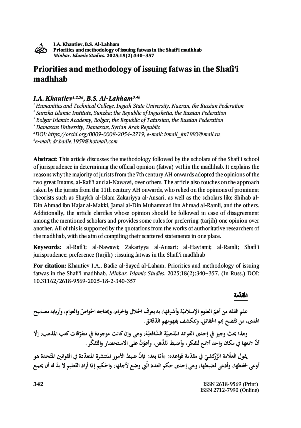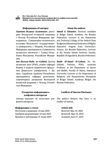 В данном исследовании рассматривается методология, которой следовали правоведы шафиитского мазхаба при определении основополагающего мнения (фетвы) в рамках своего учения. В статье объясняются причины, по которым большинство правоведов VII века хиджры и последующих периодов предпочли принять мнения двух великих имамов – ар-Рафи‘и и ан-Навави, а не других. Также в статье анализируется подход, который использовали правоведы XI века хиджры и последующих периодов, принимая мнения таких выдающихся теоретиков, как шейх-аль-ислям Закариййа аль-Ансари, и ученых Шихаб-ад-дина Ахмада ибн Хаджара аль-Макки, Джамаль-ад-дина Мухаммада ибн Ахмада ар-Рамли и др. Кроме того, в статье разъясняется, чье мнение следует принимать в случае разногласий между упомянутыми учеными, и приводятся некоторые правила определения предпочтительности (тарджих) одного мнения другому. Всё это подкрепляется цитатами из трудов авторитетных исследователей мазхаба, изложенными с целью собрать их разрозненные высказывания в одном месте.