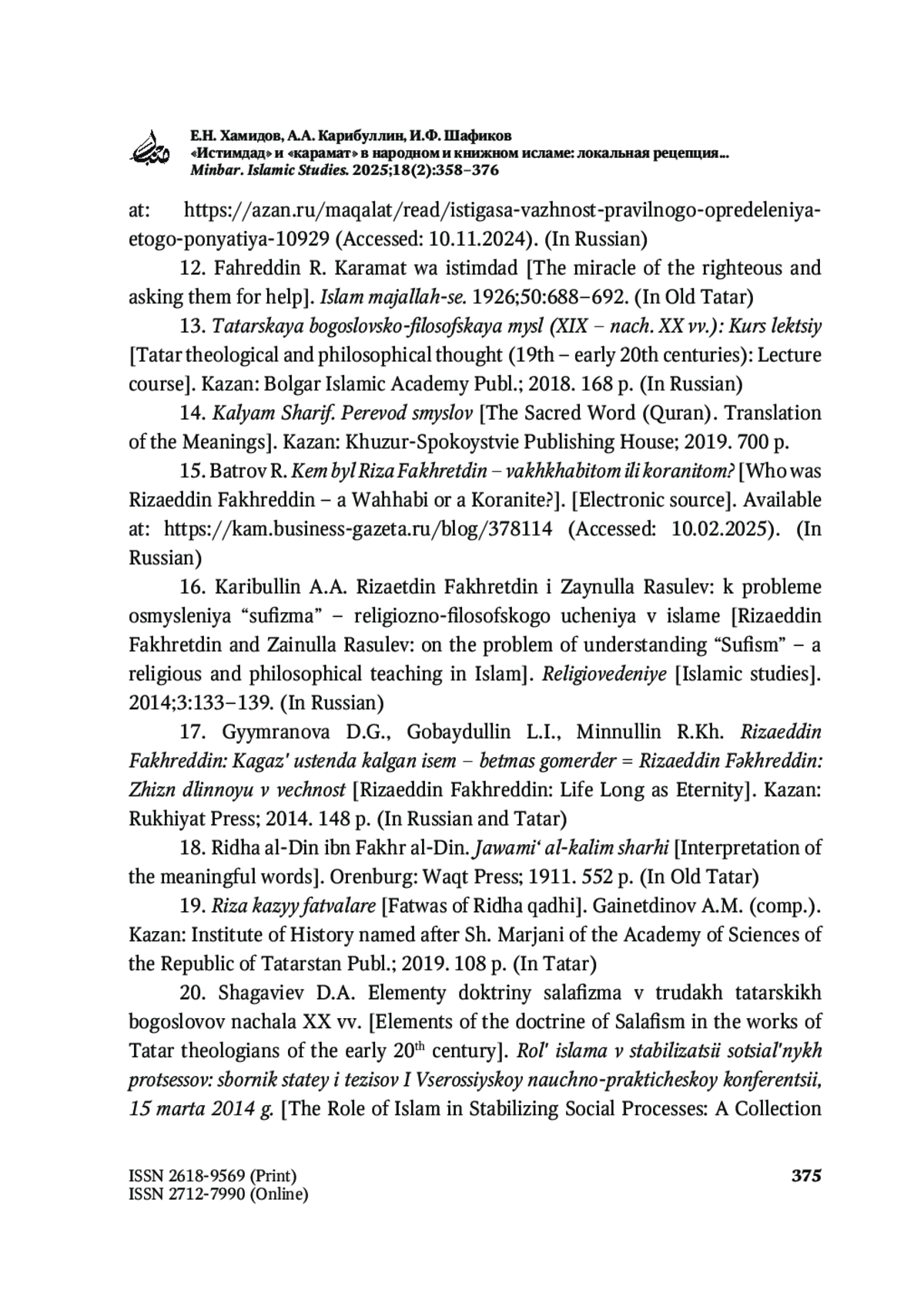 16. Карибуллин А.А. Ризаетдин Фахретдин и Зайнулла Расулев: к проблеме осмысления «суфизма» - религиозно-философского учения в исламе. Религиоведение. 2014;3:133-139.