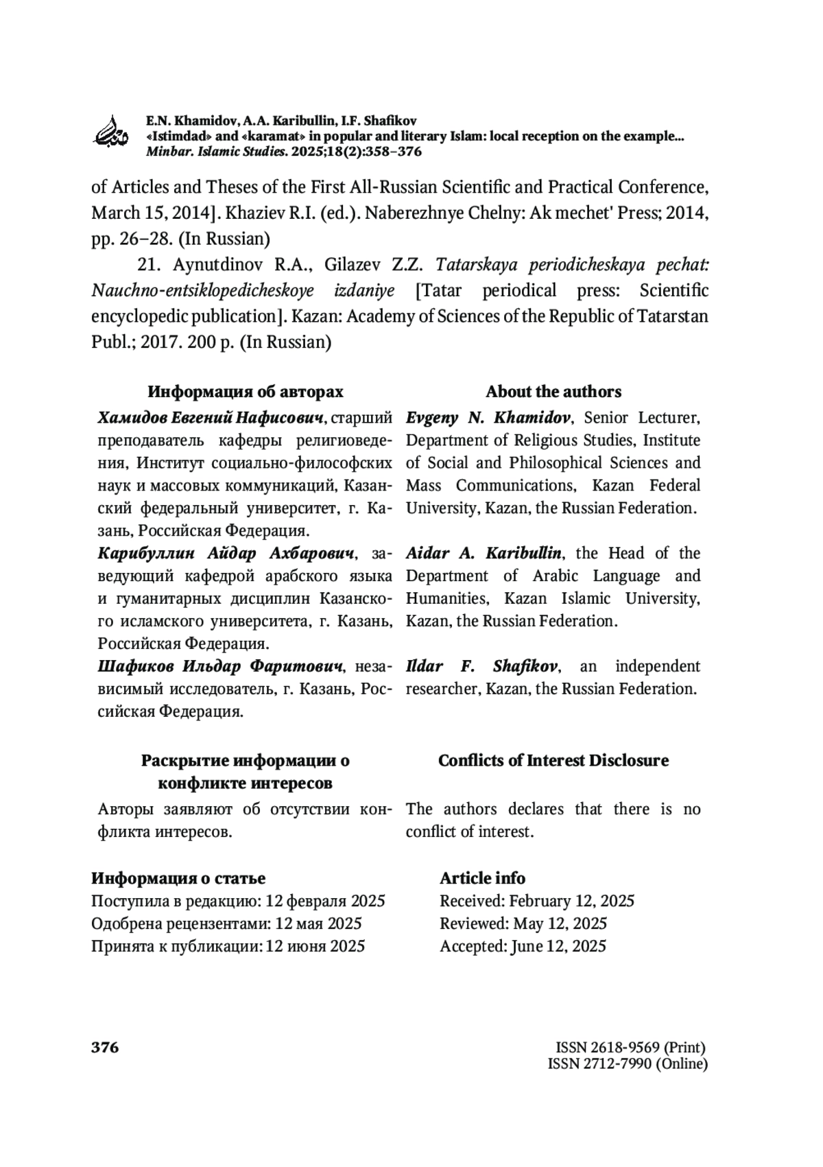 12. Фәхретдин Р. Карамәт вә истимдәд. Ислам мәҗәлләсе. 1926;50:688-692.
