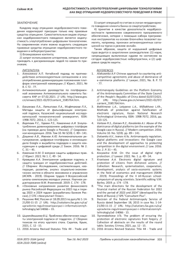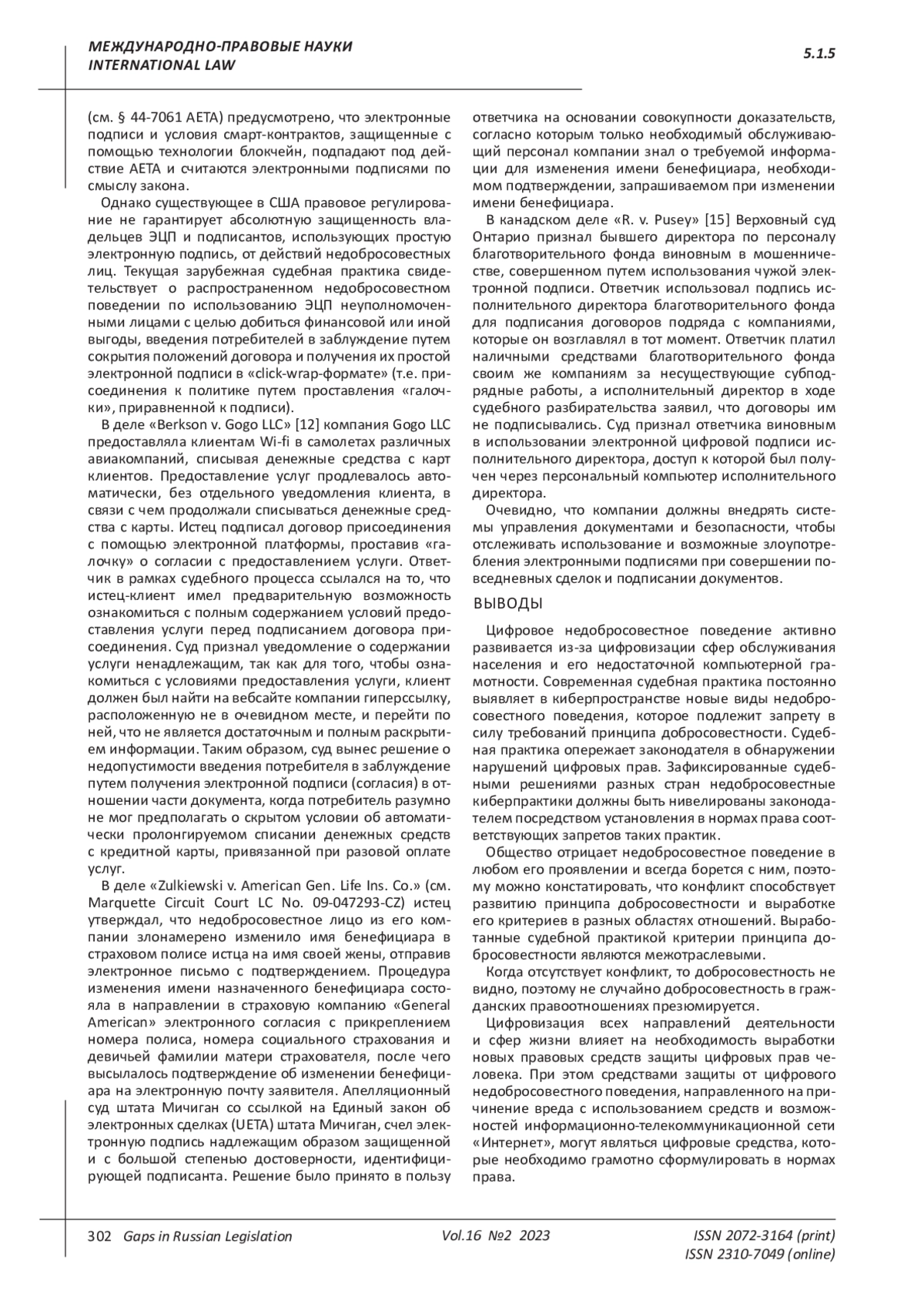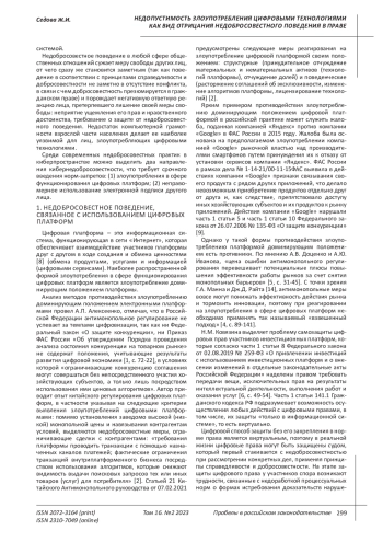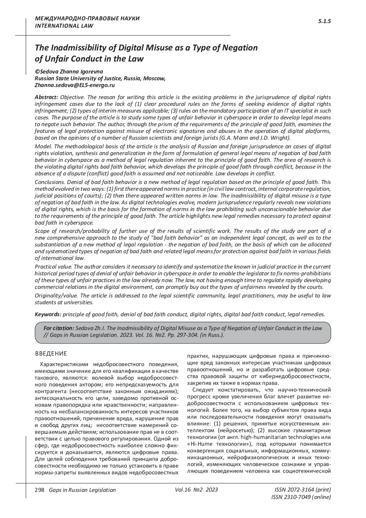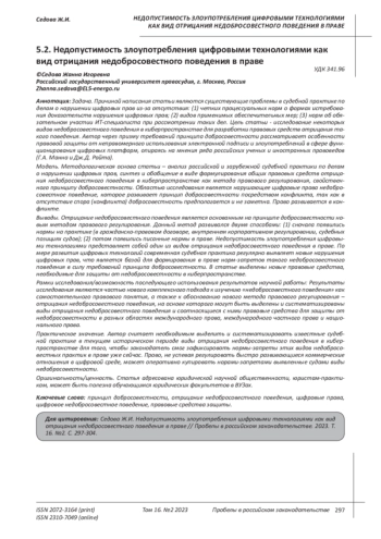 СЕДОВА Ж. И. НЕДОПУСТИМОСТЬ ЗЛОУПОТРЕБЛЕНИЯ ЦИФРОВЫМИ ТЕХНОЛОГИЯМИ КАК ВИД ОТРИЦАНИЯ НЕДОБРОСОВЕСТНОГО ПОВЕДЕНИЯ В ПРАВЕ // ПРОБЕЛЫ В РОССИЙСКОМ ЗАКОНОДАТЕЛЬСТВЕ. 2023. Т. 16 № 2