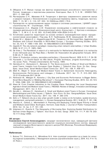 20. Parkinson M., Meegan R., Karecha J. City Size and Economic Performance: Is Bigger Better, Small More Beautiful or Midding Marvelous? // European Planning Studies. 2015. Vol. 23. N 6. Р. 1054-1068. https://doi.org/10.1080/09654313.2014.904998.