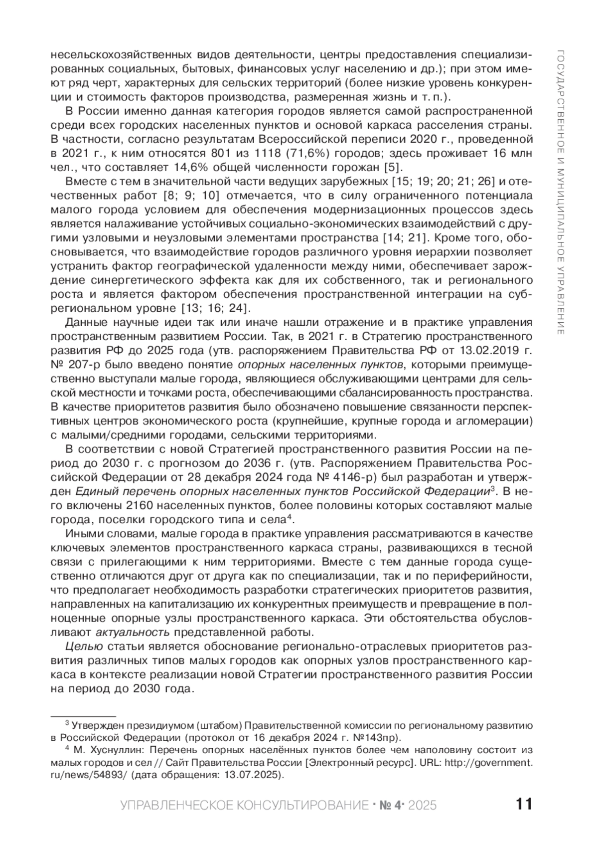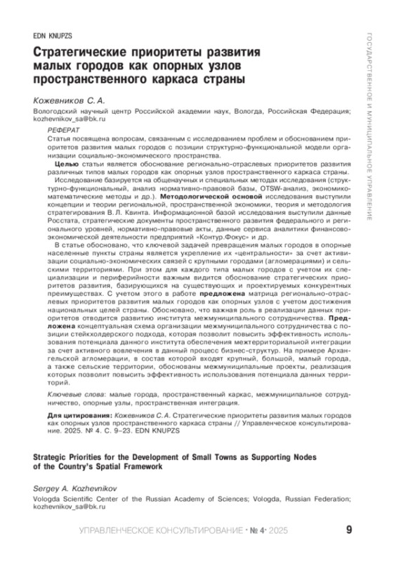 Целью статьи является обоснование регионально-отраслевых приоритетов развития различных типов малых городов как опорных узлов пространственного каркаса страны. Исследование базируется на общенаучных и специальных методах исследования (структурно-функциональный, анализ нормативно-правовой базы, OTSW-анализ, экономикоматематические методы и др.). Методологической основой исследования выступили концепции и теории региональной, пространственной экономики, теория и методология стратегирования В. Л. Квинта. Информационной базой исследования выступили данные Росстата, стратегические документы пространственного развития федерального и регионального уровней, нормативно-правовые акты, данные сервиса аналитики финансовоэкономической деятельности предприятий «Контур. Фокус» и др.
