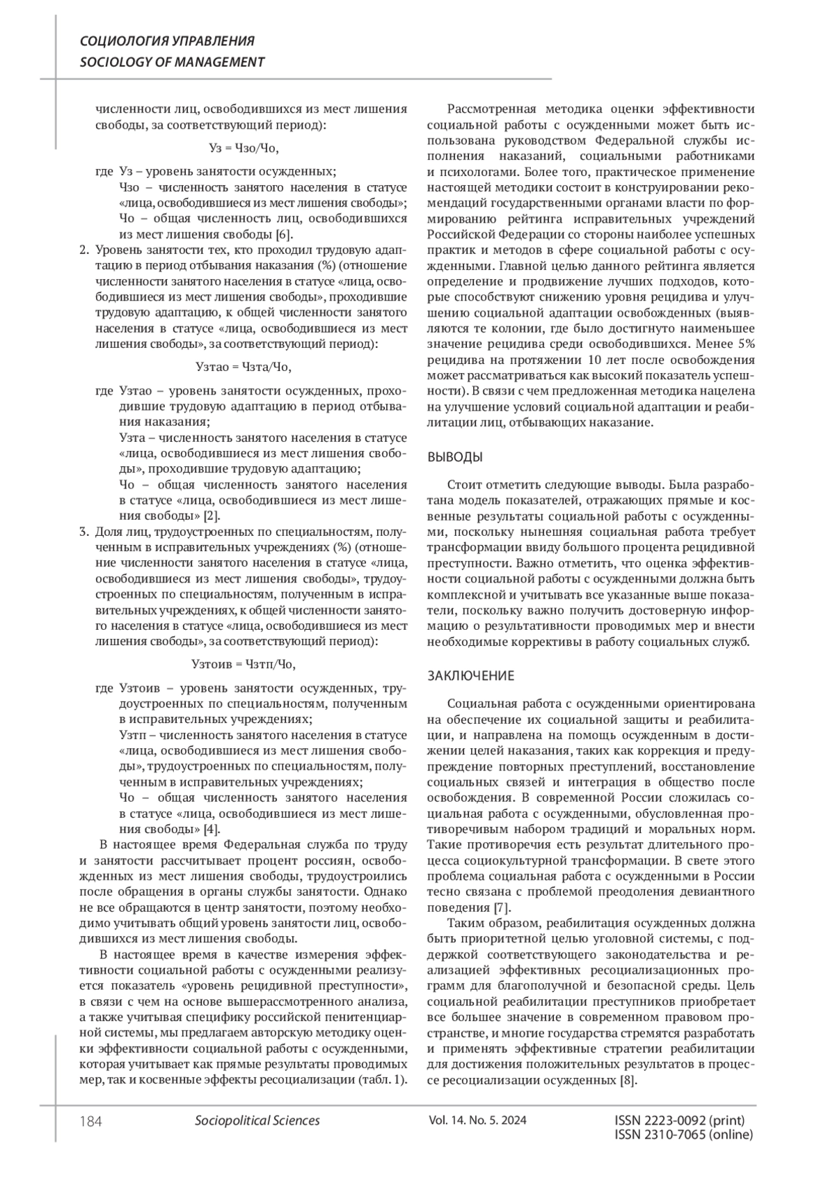 Изучение эффективности социальной работы с осужденными является одним из актуальных направлений современных социальных исследований и включают в себя оценку достижения целей, поставленных перед пенитенциарной системой. В связи с этим необходимо проводить мониторинг и анализ различных параметров – уровень рецидива, социальная реабилитация осужденных (в том числе лиц, отбывших наказание), их уровень образования и профессиональной подготовки. Одним из способов изучения эффективности социальной работы с осужденными является сравнение результатов работы различных исправительных учреждений с целью выявления наиболее успешных практик и методов. Настоящий подход определяет факторы успеха или неуспеха организации такой работы и возможные меры для улучшения ситуации [1].