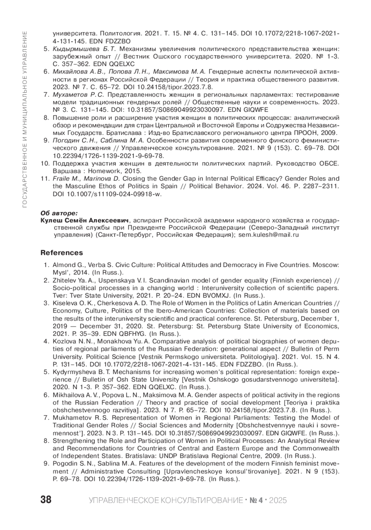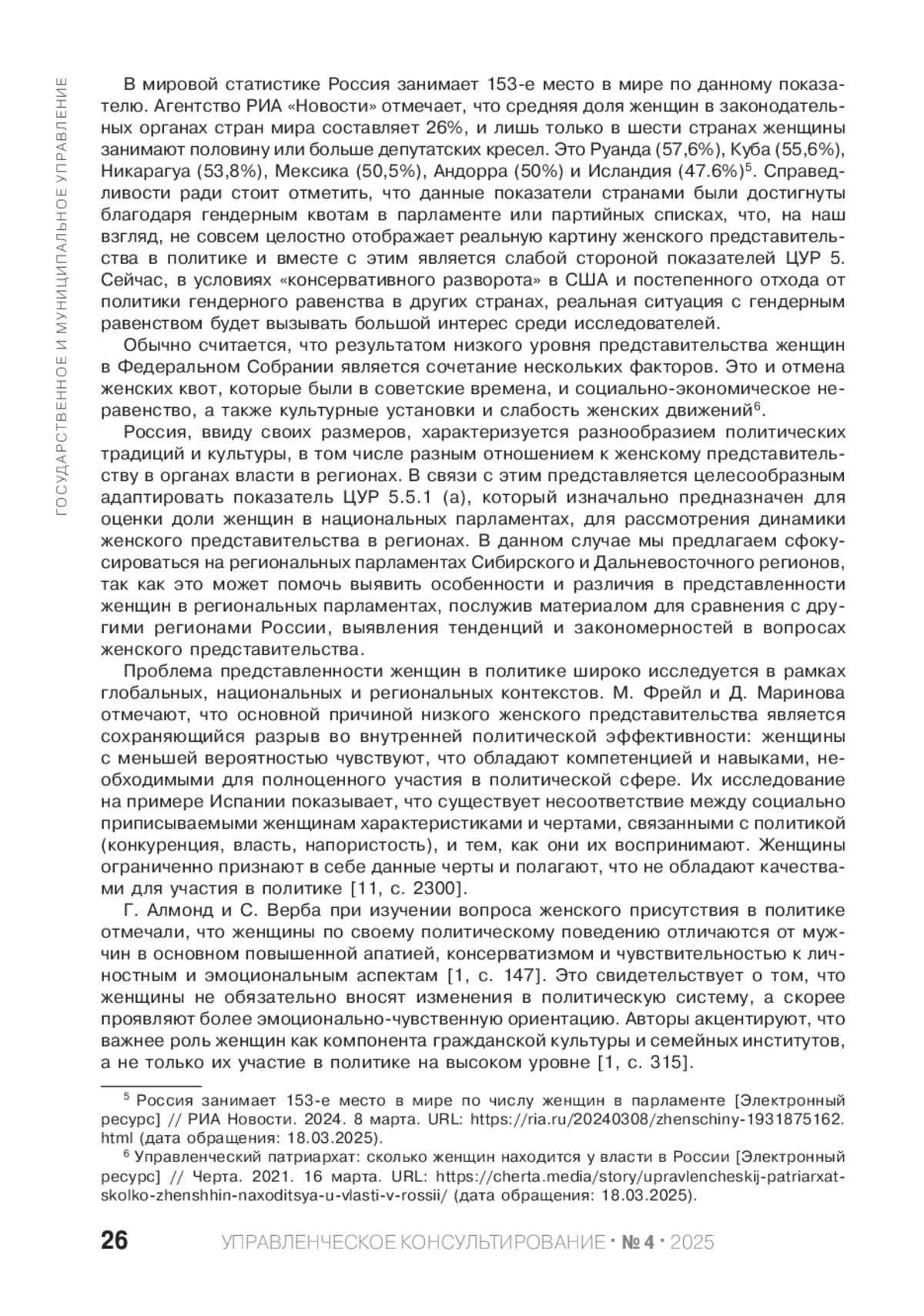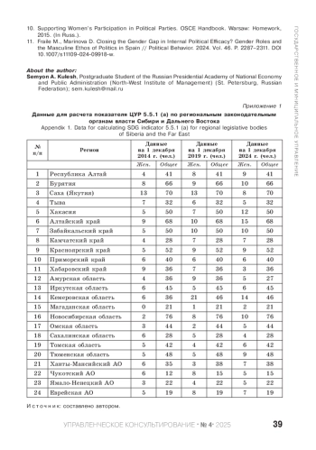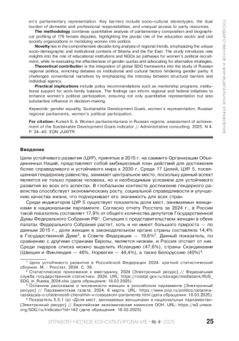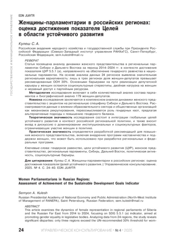 КУЛЕШ С. А. ЖЕНЩИНЫ-ПАРЛАМЕНТАРИИ В РОССИЙСКИХ РЕГИОНАХ: ОЦЕНКА ДОСТИЖЕНИЯ ПОКАЗАТЕЛЯ ЦЕЛЕЙ В ОБЛАСТИ УСТОЙЧИВОГО РАЗВИТИЯ // УПРАВЛЕНЧЕСКОЕ КОНСУЛЬТИРОВАНИЕ. 2025. № 4 (190)