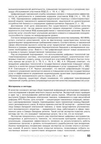 Научная новизна исследования заключается в адаптации метода экспертного анкетирования к специфике электронных таможен в условиях цифровой трансформации. В отличие от типовых исследований качества государственных услуг, фокус сделан на оценке перспектив внедрения конкретных цифровых инструментов, выявлении рисков и барьеров, а также их влиянии на скорость предоставления услуг, правомерность принимаемых решений и результативность работы таможенных органов.