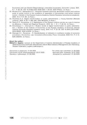 2. Аргатов М. А., Десятниченко О.Ю. Диспетчеризация таможенных деклараций: новые возможности и проблемы для участников ВЭД и ФТС России // Управленческое консультирование. 2023. № 8. C. 74-85. https://doi.org/10.22394/1726-1139-2023-8-74-85.