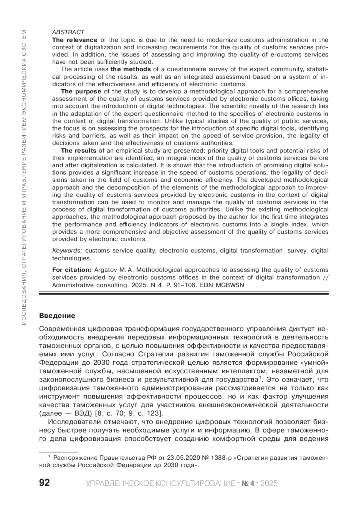Цель исследования — разработать методический подход комплексной оценки качества таможенных услуг, предоставляемых электронными таможнями, с учетом внедрения цифровых технологий.