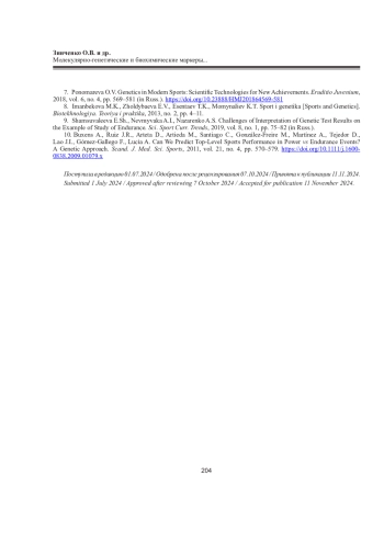 9. Шамсувалеева Э.Ш., Невмывака А.И., Назаренко А.С. Проблемы интерпретации результатов генетического тестирования на примере изучения выносливости // Наука и спорт: соврем. тенденции. 2020. Т. 8, No 1. С. 75-82.