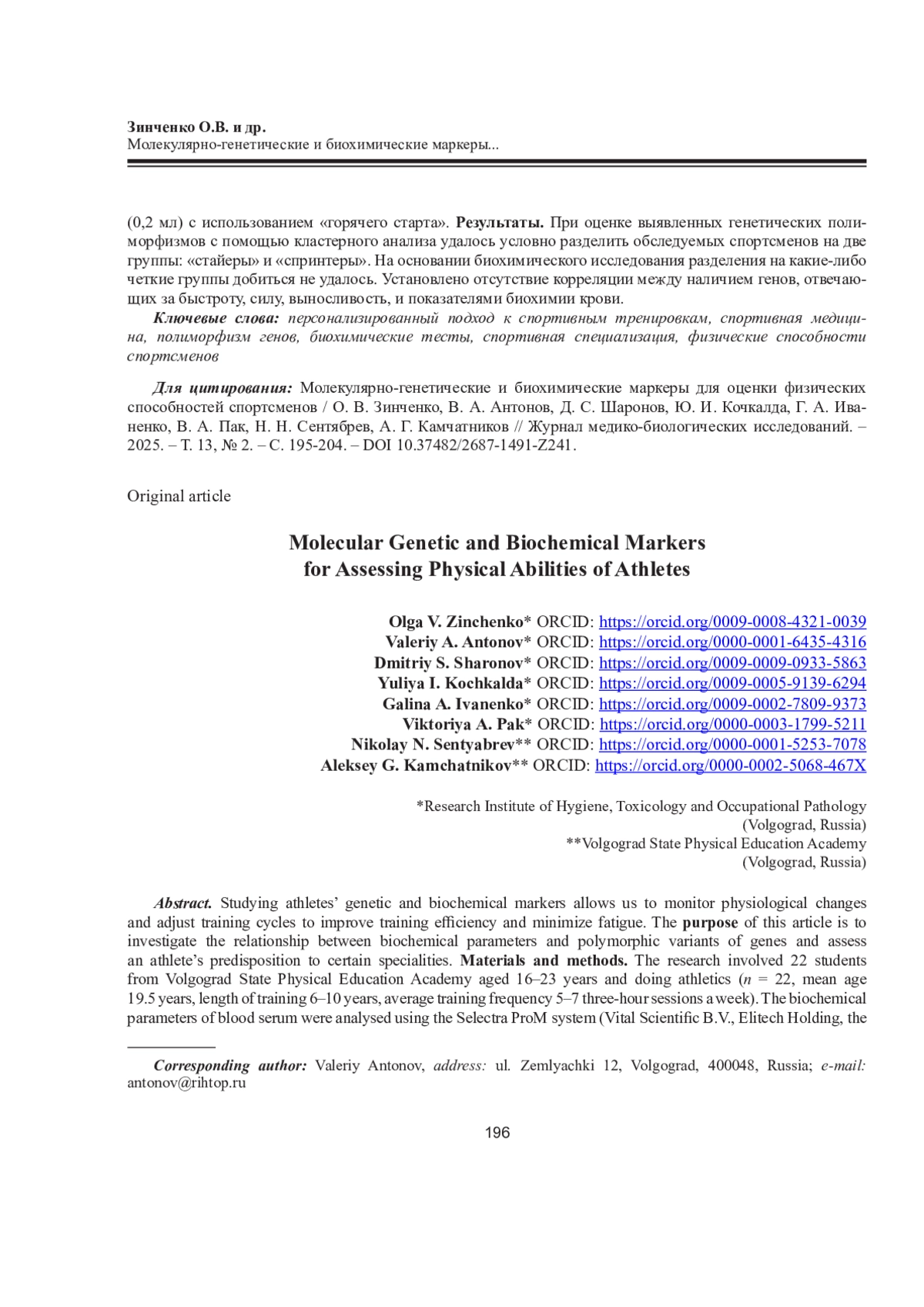 Цель работы - изучить взаимосвязь между биохимическими параметрами и полиморфными вариантами генов, анализируемыми при оценке предрасположенности спортсмена к различным специализациям.