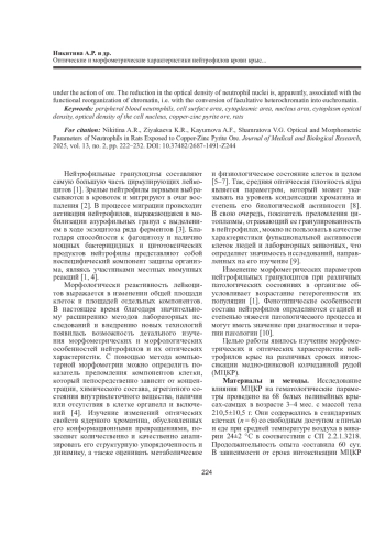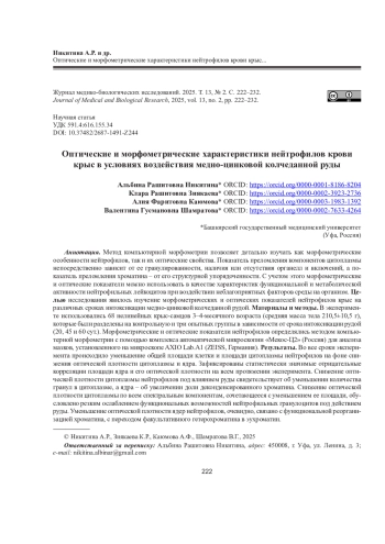 Материалы и методы. В эксперименте использовались 68 нелинейных крыс-самцов 3-4-месячного возраста (средняя масса тела 210,5±10,5 г), которые были разделены на контрольную и три опытных группы в зависимости от срока интоксикации рудой (20, 45 и 60 сут.). Морфометрические и оптические показатели нейтрофилов определялись методом компьютерной морфометрии с помощью комплекса автоматической микроскопии «Мекос-Ц2» (Россия) для анализа мазков, установленного на микроскопе AXIO Lab. A1 (ZEISS, Германия).