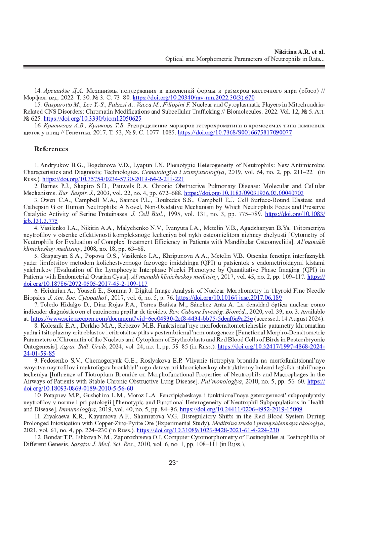8. Колесник Е.А., Дерхо М.А., Ребезов М.Б. Функциональные морфоденситометрические параметры хроматина ядра и цитоплазмы эритробластов и эритроцитов птиц в постэмбриональном онтогенезе // Аграр. вестн. Урала. 2024. Т. 24, No 1. С. 59-85. DOI: 10.32417/1997-4868-2024-24-01-59-85 EDN: MYWOZF