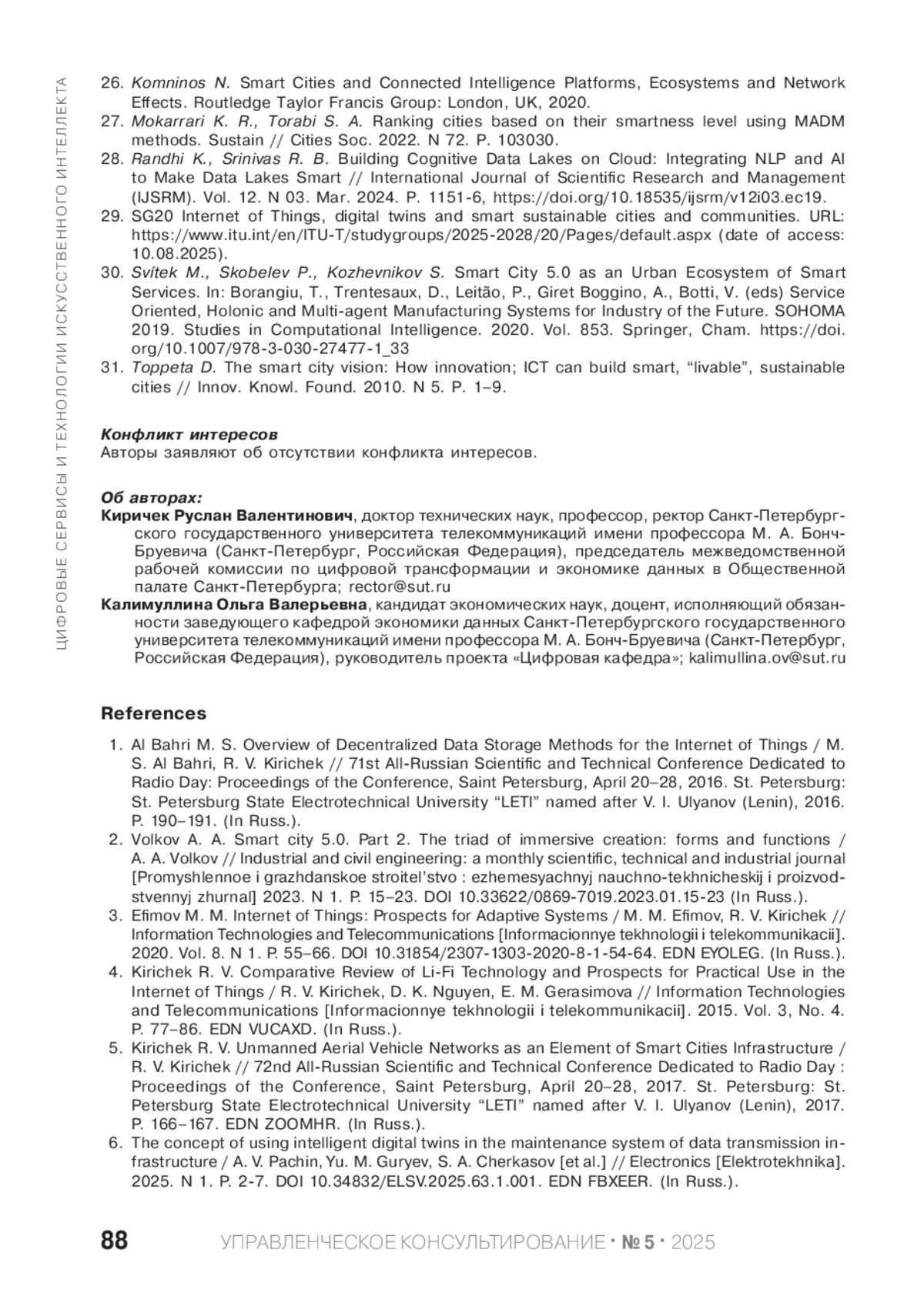 12. Татаринов К. А. Влияние цифровизации на развитие «умных городов» / К. А. Татаринов, Н. Н. Аникиенко, И. А. Савченко, С. М. Музыка // Экономика и управление: проблемы, решения. 2024. Т. 9. № 6 (147). С. 147-152. https://doi.org/10.36871/ek.up.p.r.2024.06.09.018. EDN ZVIZML