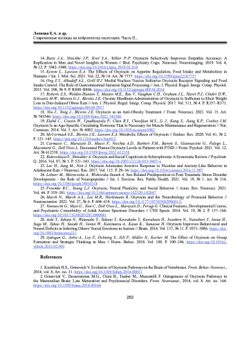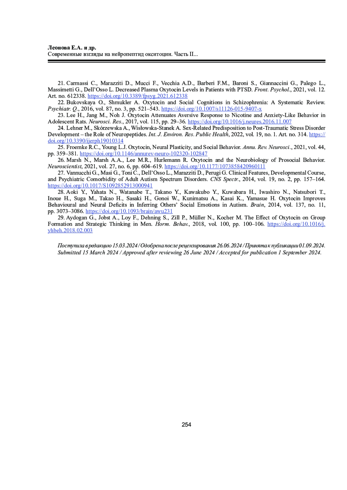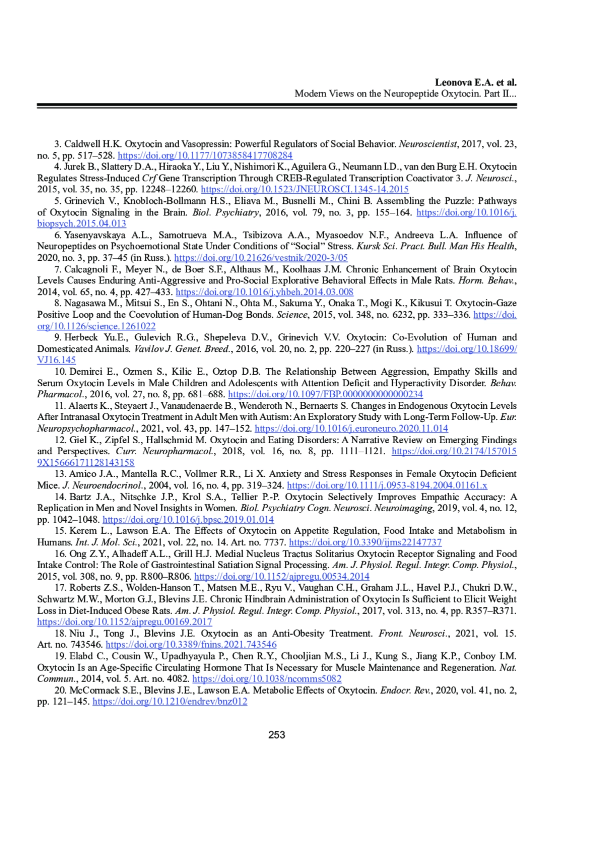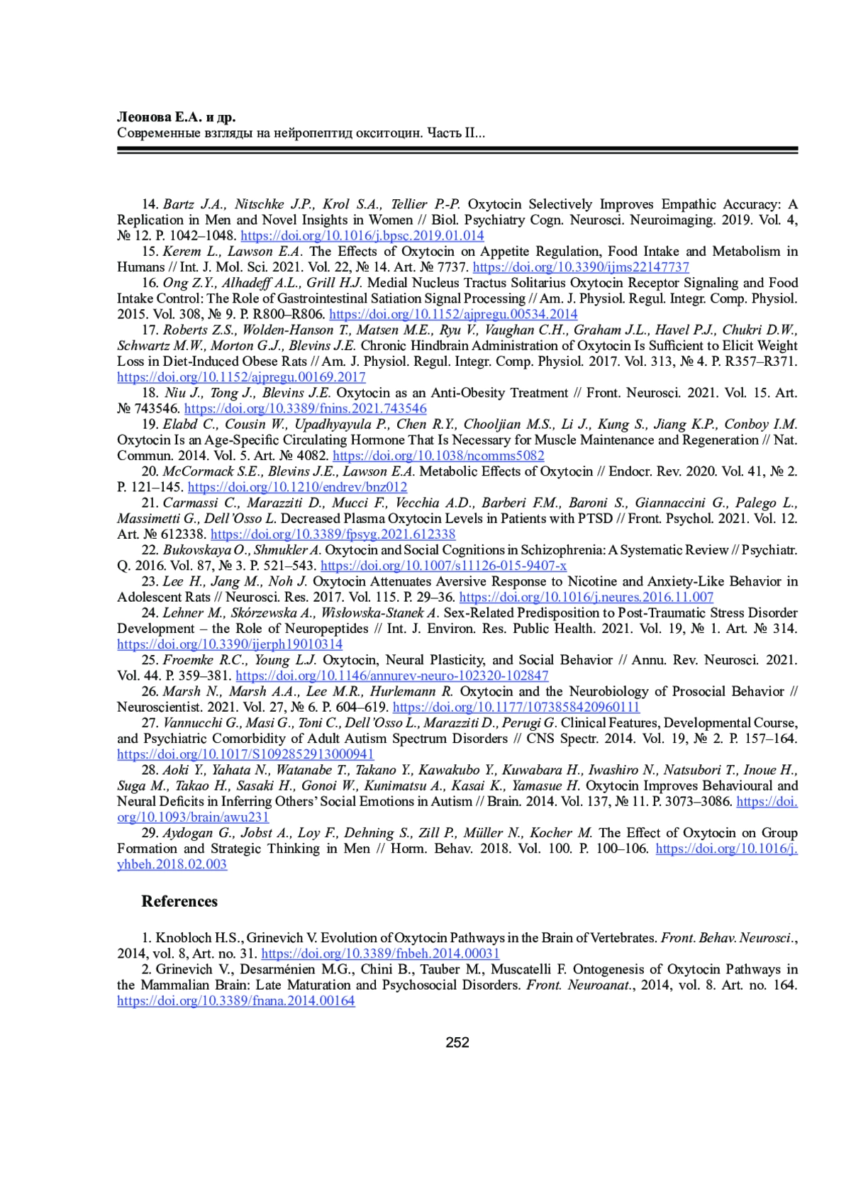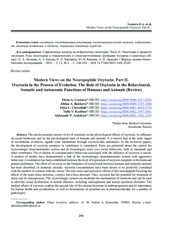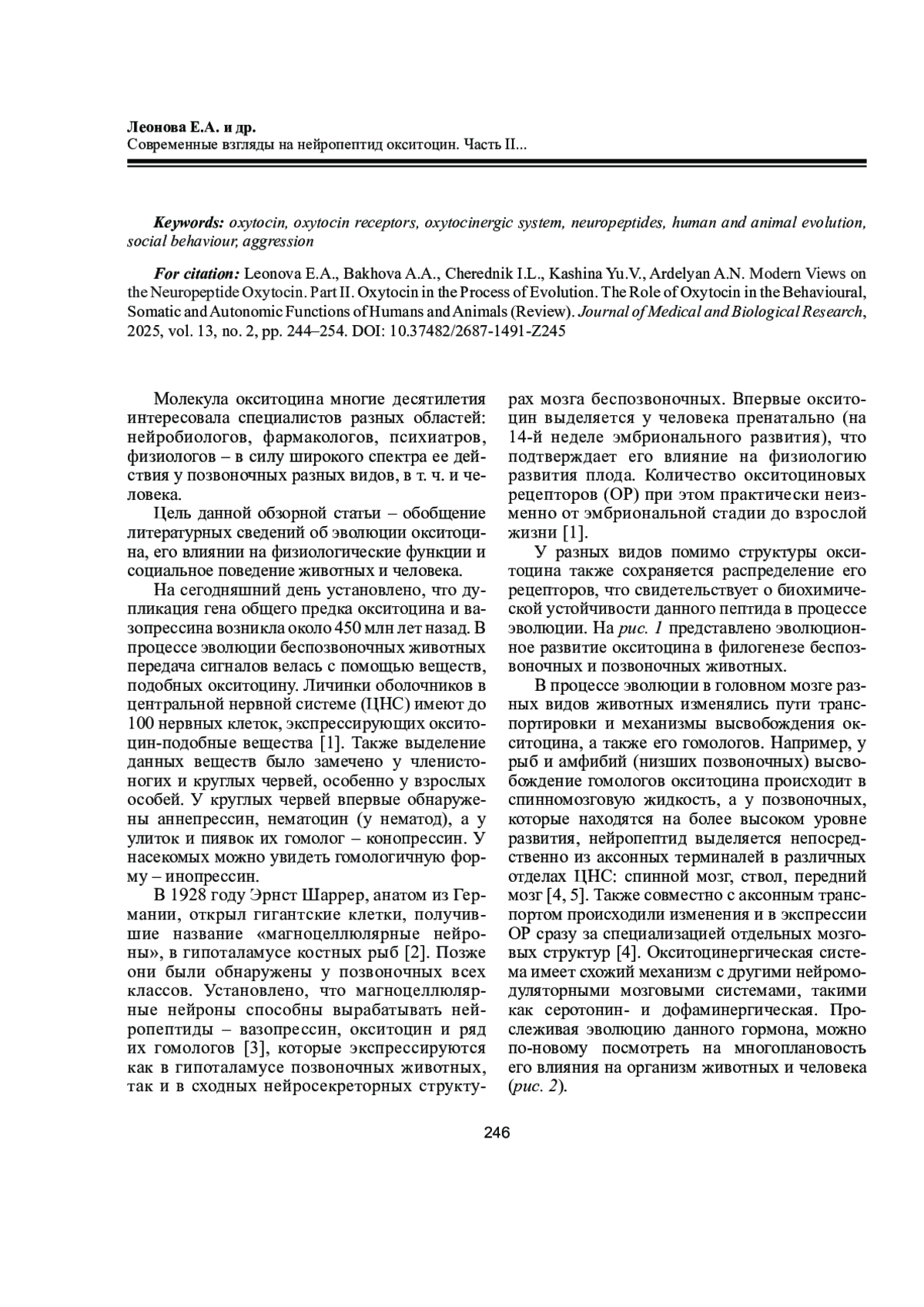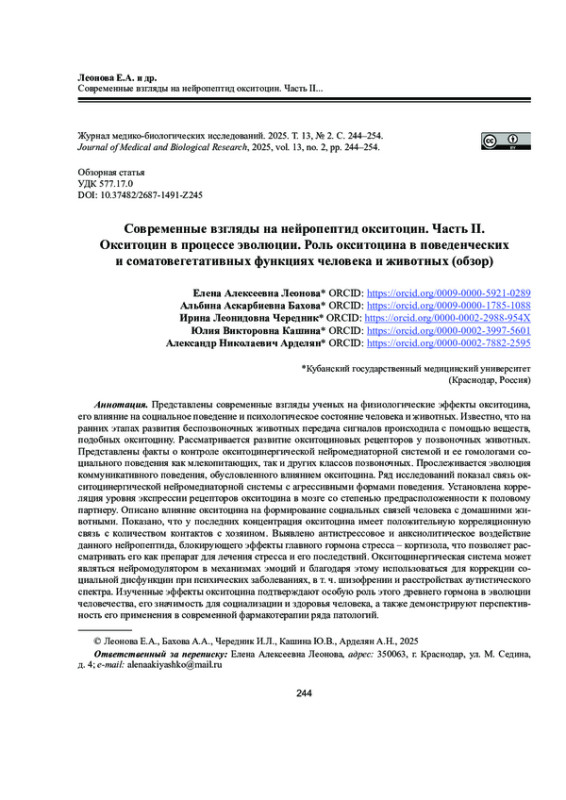 ЛЕОНОВА Е. А., БАХОВА А. А., ЧЕРЕДНИК И. Л., КАШИНА Ю. В., АРДЕЛЯН А. Н. СОВРЕМЕННЫЕ ВЗГЛЯДЫ НА НЕЙРОПЕПТИД ОКСИТОЦИН. ЧАСТЬ II. ОКСИТОЦИН В ПРОЦЕССЕ ЭВОЛЮЦИИ. РОЛЬ ОКСИТОЦИНА В ПОВЕДЕНЧЕСКИХ И СОМАТОВЕГЕТАТИВНЫХ ФУНКЦИЯХ ЧЕЛОВЕКА И ЖИВОТНЫХ (ОБЗОР) // ЖУРНАЛ МЕДИКО-БИОЛОГИЧЕСКИХ ИССЛЕДОВАНИЙ. 2025. Т. 13 № 2