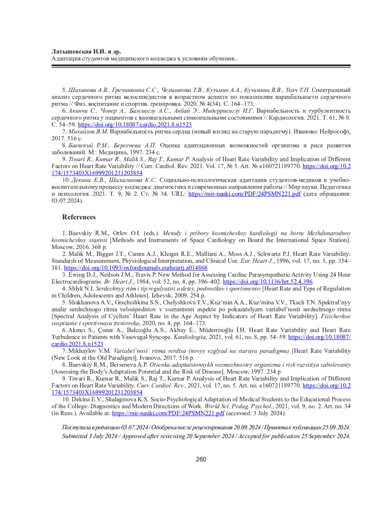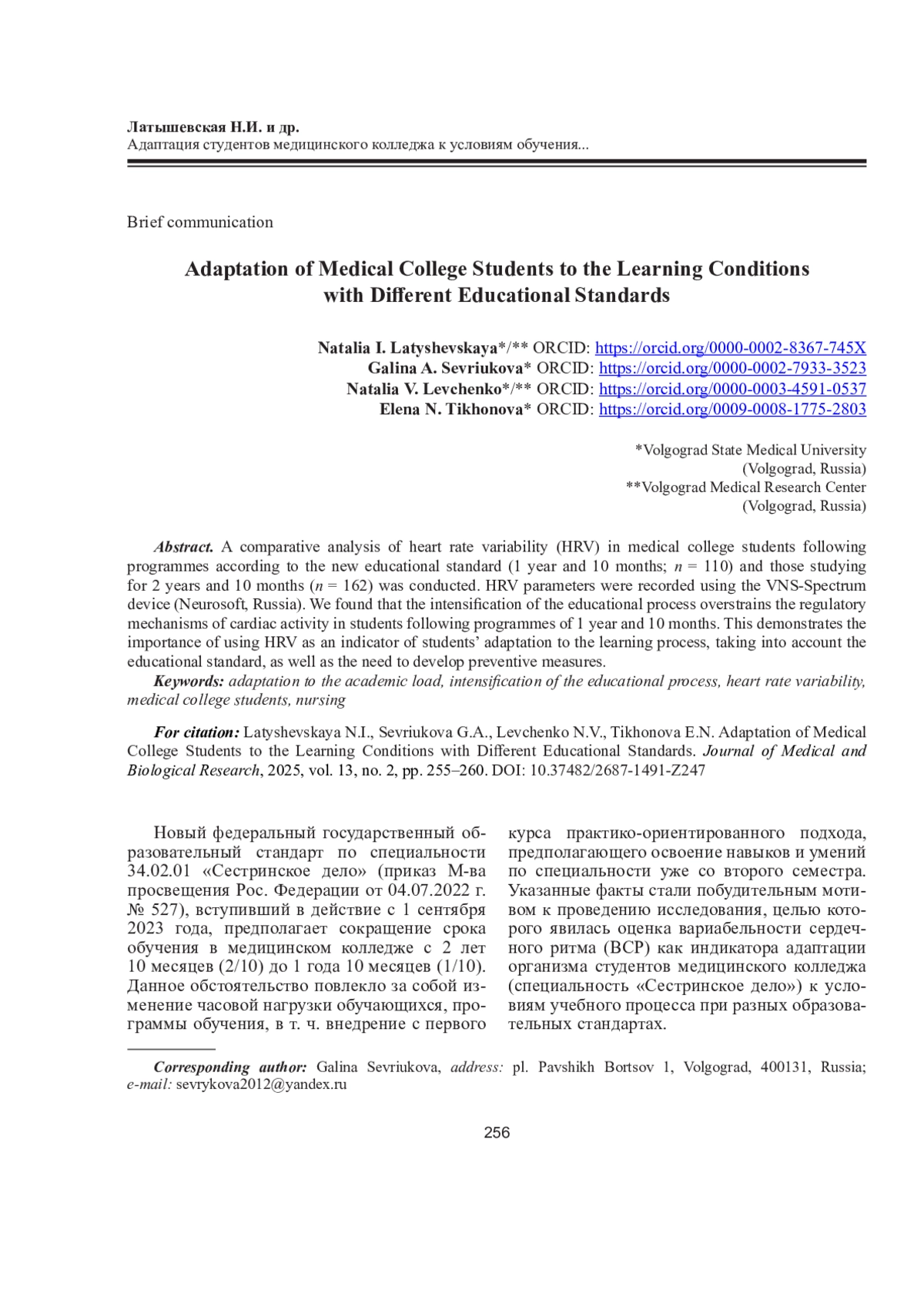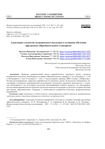 ЛАТЫШЕВСКАЯ Н. И., СЕВРЮКОВА Г. А., ЛЕВЧЕНКО Н. В., ТИХОНОВА Е. Н. АДАПТАЦИЯ СТУДЕНТОВ МЕДИЦИНСКОГО КОЛЛЕДЖА К УСЛОВИЯМ ОБУЧЕНИЯ ПРИ РАЗНЫХ ОБРАЗОВАТЕЛЬНЫХ СТАНДАРТАХ // ЖУРНАЛ МЕДИКО-БИОЛОГИЧЕСКИХ ИССЛЕДОВАНИЙ. 2025. Т. 13 № 2