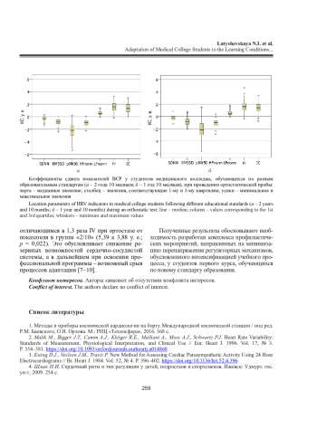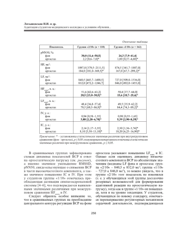 Проведен сравнительный анализ вариабельности сердечного ритма студентов медицинского колледжа, обучающихся по новому образовательному стандарту (1 год 10 месяцев; n = 110) и обучающихся 2 года 10 месяцев (n = 162). С использованием прибора «ВНС-Спектр» («Нейрософт», Россия) регистрировались параметры вариабельности сердечного ритма. В результате проведенного исследования установлено перенапряжение регуляторных механизмов сердечной деятельности у студентов, обучающихся 1 год 10 месяцев, вследствие интенсификации учебного процесса. Это обосновывает использование вариабельности сердечного ритма как показателя адаптации студентов к условиям обучения при разных образовательных стандартах и необходимость разработки комплекса профилактических мероприятий.
