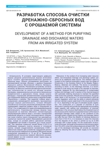 В условиях нарастающего дефицита водных ресурсов дополнительным водным источником могут служить маломинерализованные дренажносбросные воды. Объект исследования расположен на мелиоративной системе «Восход» у деревни Ходоровка Горецкого района Могилевской области, Беларусь. Материалы и методы. Рассмотрено устройство, согласно которому, на сбросных каналах рекомендуется расположение строительства по длине его каскада каналовбиопрудов, предназначенных для доочистки загрязненных поверхностного и дренажного стоков, секции каналабиопруда с подпорными автоматическими сооружениями для подержания заданного уровня воды в верхнем бьефе. Результаты и выводы. При заданной глубине воды в сооружениях рекомендуется высаживать высокорослую высшую водную растительность, которая обладает способностью поглощать загрязняющие вещества и может поддерживать заданный уровень воды в сооружениях от 0,5 до 1,5 м, в зависимости от вида культивируемой водной растительности. Строительство каскада каналов таких сооружений на практике обеспечит соответствующие аккумулирующие емкости воды с отстоем и выпадением химических веществ в створе непосредственно сооружения (ниже отметки порога сооружения) при максимально подпертым горизонтом уровня сбрасываемой дренажной воды, исходя из условий работы дренажной системы, создаваемой при поливе и осушения, до и после окончания. При заилении отдельных секций более 0,10-0,15 м необходимо проводить очистку каналов от отложений наилка, которая осуществляется экскаватором Э-304 с ремонтным ковшом. Для устройства сооружений данного типа при уклонах поверхности не менее 0,005 длина секций сооружений принимается от 10 до 40 м. Применение разработанной технологии позволит обеспечить экономический эффект за счет снижения затрат подачи воды на оросительную систему.
