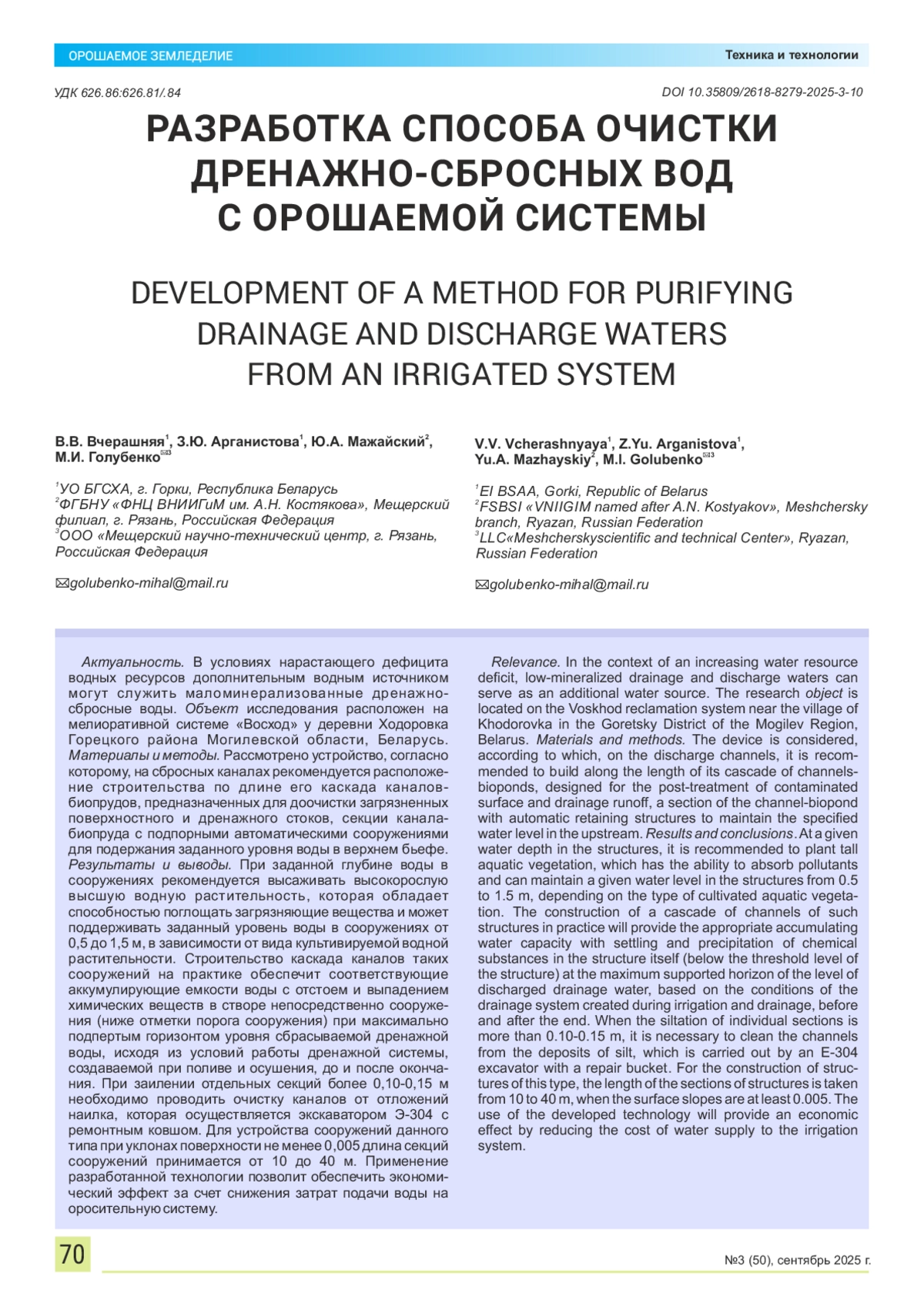 4. Дрововозова Т.И., Кириленко А.А. Совершенствование технического подхода к управлению процессом локальной очистки дренажного стока с орошаемых земель // Мелиорация и гидротехника. 2023. Т. 13. № 2. С. 94-108.