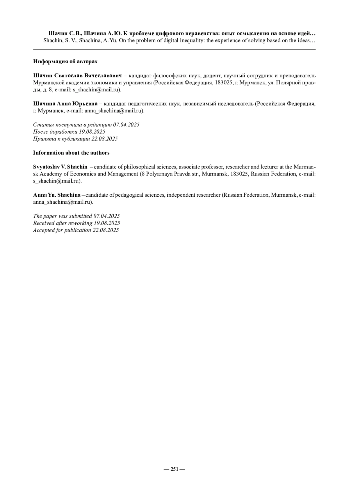 1. Шабашев В.А., Щербакова Л.Н. Тенденции цифрового равенства/неравенства в современном мире // Социологические исследования. 2016. № 9. С. 3-12.