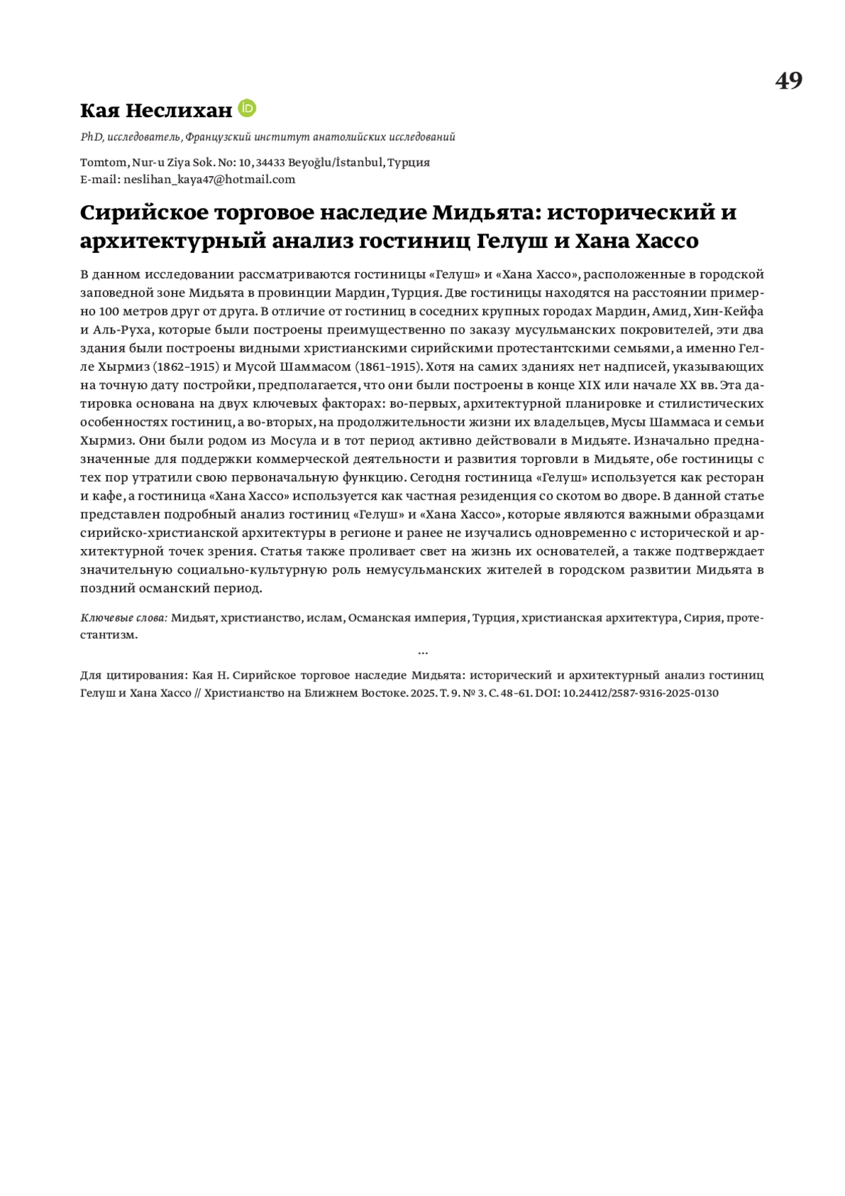 КАЯ Н. СИРИЙСКОЕ ТОРГОВОЕ НАСЛЕДИЕ МИДЬЯТА: ИСТОРИЧЕСКИЙ И АРХИТЕКТУРНЫЙ АНАЛИЗ ГОСТИНИЦ ГЕЛУШ И ХАНА ХАССО // ХРИСТИАНСТВО НА БЛИЖНЕМ ВОСТОКЕ. 2025. № 3, ТОМ 9