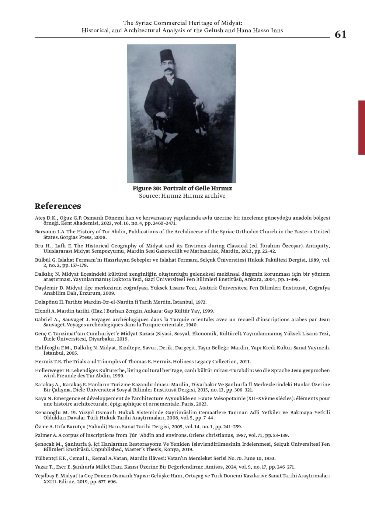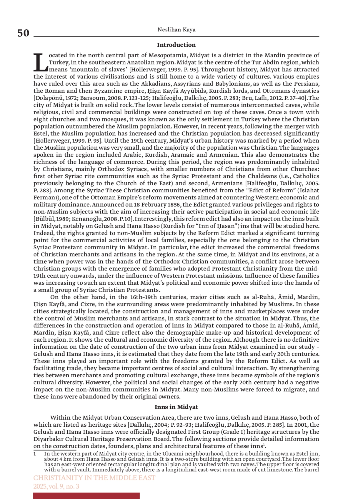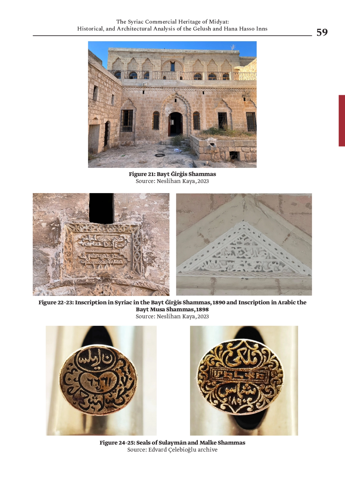 This study examines the Gelush and Hana Hasso inns, which are located within the urban conservation area of Midyat in the Mardin Province of Turkey. The two inns are situated approximately 100 metres apart. Unlike the inns in the surrounding major cities of Mardin, Ᾱmid (Diyarbakır), Ḥiṣn Kayfā and al-Ruhā (Şanlıurfa), which were predominantly commissioned by Muslim patrons, these two significant buildings were constructed by prominent Christian Syrian Protestant families: specifically, Gelle Hırmız (1862–1915) and Musa Shammas (1861– 1915). While there are no inscriptions on the buildings themselves providing a precise construction date, it is estimated that they were built in the late 19th or early 20th century. This dating is based on two key factors: firstly, the architectural layout and stylistic features of the inns, and secondly, the life spans of their patrons, Musa Shammas and the Hırmız family. They were originally from Mosul and were active in Midyat during that period. Originally intended to support commercial activity and promote trade in Midyat, both inns have since lost their original function. Today, the Gelush Inn serves as a restaurant and café, while the Hana Hasso Inn is used as a private residence with livestock kept in its courtyard. This article provides a detailed assessment of the Gelush and Hana Hasso inns, which are important examples of Syriac Christian architecture in the region and have not previously been studied together from historical or architectural perspectives. It also sheds light on the lives of their founders and the wider socio-cultural role of non-Muslim patrons in the urban development of Midyat during the late Ottoman period.
