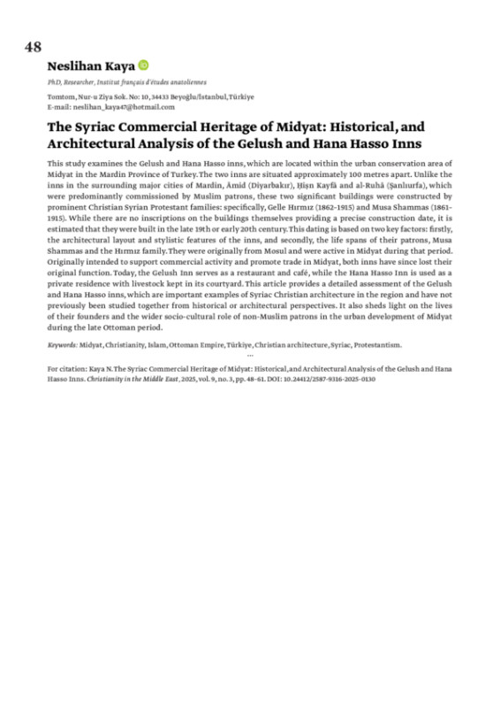 В данном исследовании рассматриваются гостиницы «Гелуш» и «Хана Хассо», расположенные в городской заповедной зоне Мидьята в провинции Мардин, Турция. Две гостиницы находятся на расстоянии примерно 100 метров друг от друга. В отличие от гостиниц в соседних крупных городах Мардин, Амид, Хин-Кейфа и Аль-Руха, которые были построены преимущественно по заказу мусульманских покровителей, эти два здания были построены видными христианскими сирийскими протестантскими семьями, а именно Гелле Хырмиз (1862–1915) и Мусой Шаммасом (1861–1915). Хотя на самих зданиях нет надписей, указывающих на точную дату постройки, предполагается, что они были построены в конце XIX или начале XX вв. Эта датировка основана на двух ключевых факторах: во-первых, архитектурной планировке и стилистических особенностях гостиниц, а во-вторых, на продолжительности жизни их владельцев, Мусы Шаммаса и семьи Хырмиз. Они были родом из Мосула и в тот период активно действовали в Мидьяте. Изначально предназначенные для поддержки коммерческой деятельности и развития торговли в Мидьяте, обе гостиницы с тех пор утратили свою первоначальную функцию. Сегодня гостиница «Гелуш» используется как ресторан и кафе, а гостиница «Хана Хассо» используется как частная резиденция со скотом во дворе. В данной статье представлен подробный анализ гостиниц «Гелуш» и «Хана Хассо», которые являются важными образцами сирийско-христианской архитектуры в регионе и ранее не изучались одновременно с исторической и архитектурной точек зрения. Статья также проливает свет на жизнь их основателей, а также подтверждает значительную социально-культурную роль немусульманских жителей в городском развитии Мидьята в поздний османский период.