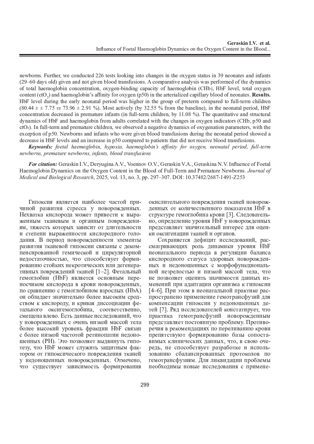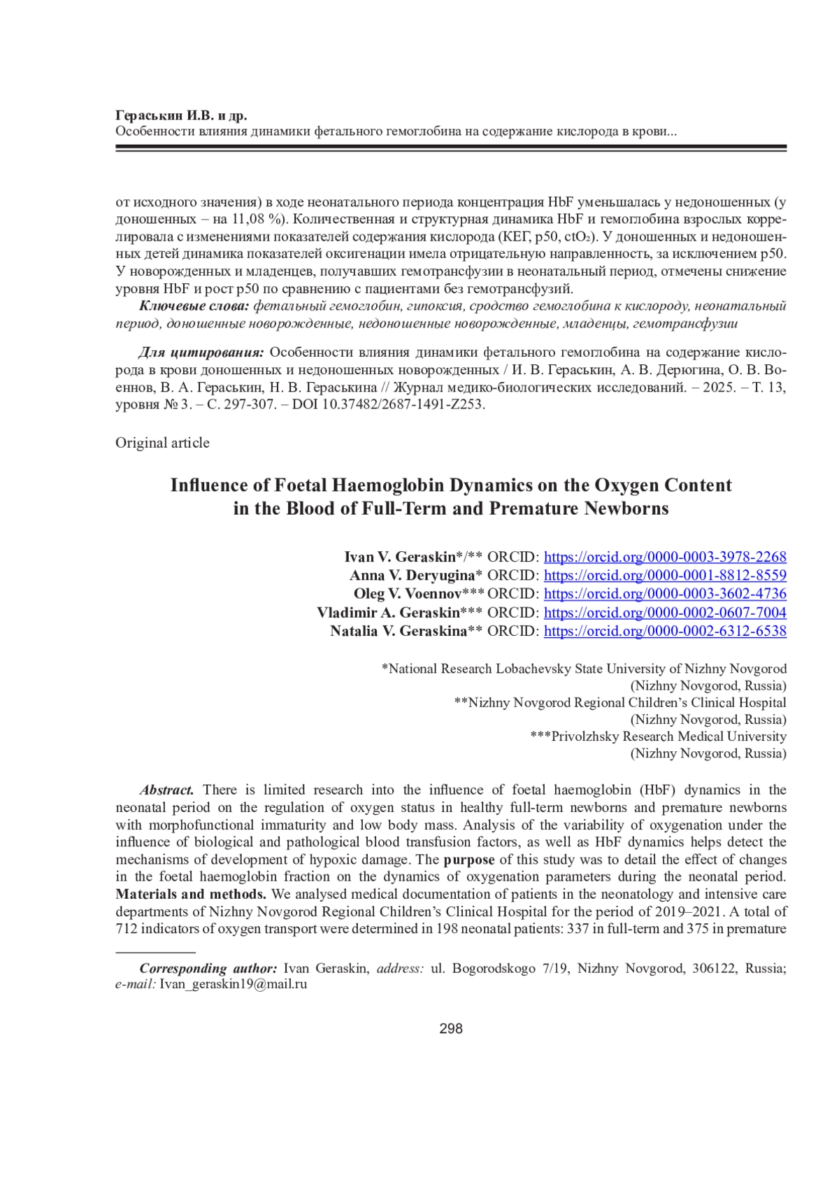 ГЕРАСЬКИН И. В., ДЕРЮГИНА А. В., ВОЕННОВ О. В., ГЕРАСЬКИН В. А., ГЕРАСЬКИНА Н. В. ОСОБЕННОСТИ ВЛИЯНИЯ ДИНАМИКИ ФЕТАЛЬНОГО ГЕМОГЛОБИНА НА СОДЕРЖАНИЕ КИСЛОРОДА В КРОВИ ДОНОШЕННЫХ И НЕДОНОШЕННЫХ НОВОРОЖДЕННЫХ // ЖУРНАЛ МЕДИКО-БИОЛОГИЧЕСКИХ ИССЛЕДОВАНИЙ. 2025. Т. 13 № 3