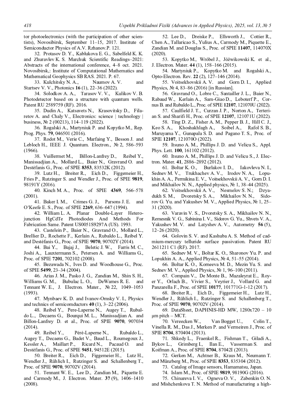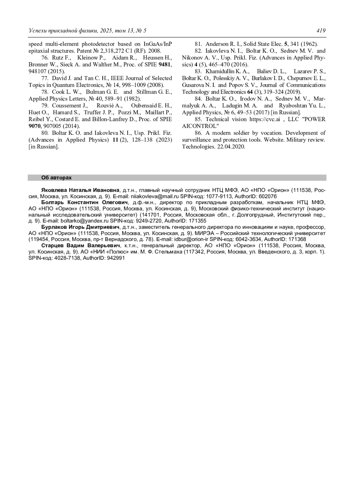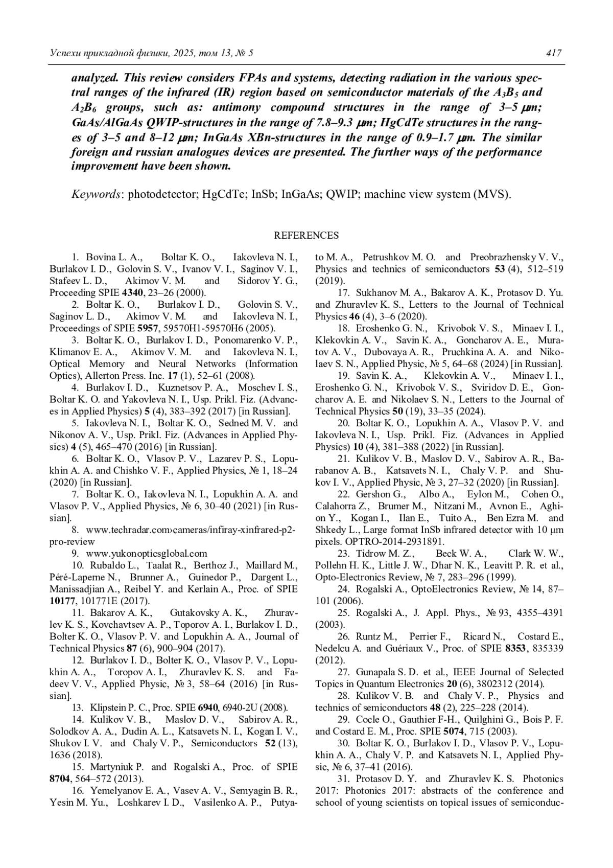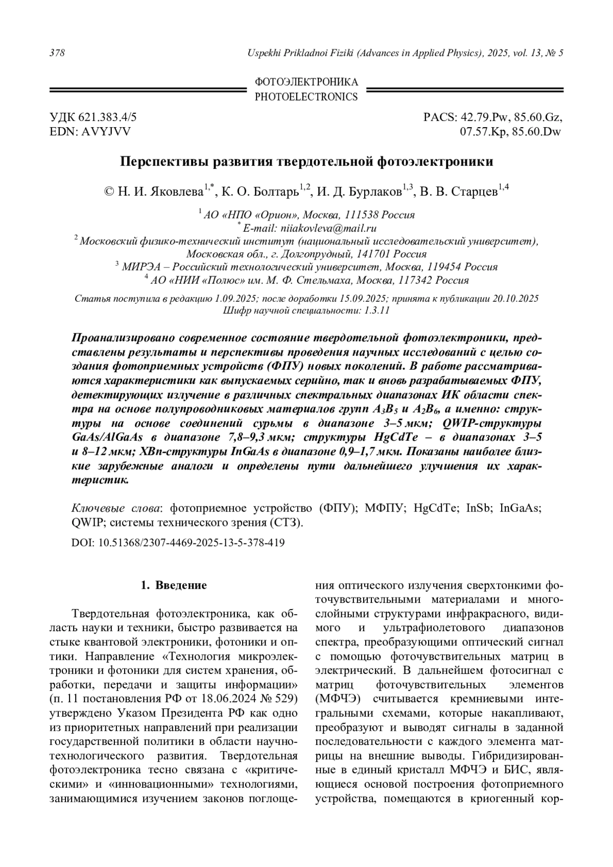 ЯКОВЛЕВА Н., БОЛТАРЬ К., БУРЛАКОВ И., СТАРЦЕВ В. В. ПЕРСПЕКТИВЫ РАЗВИТИЯ ТВЕРДОТЕЛЬНОЙ ФОТОЭЛЕКТРОНИКИ // УСПЕХИ ПРИКЛАДНОЙ ФИЗИКИ. 2025. №5