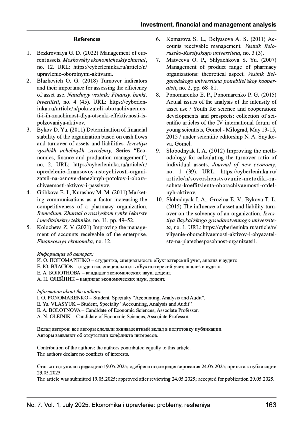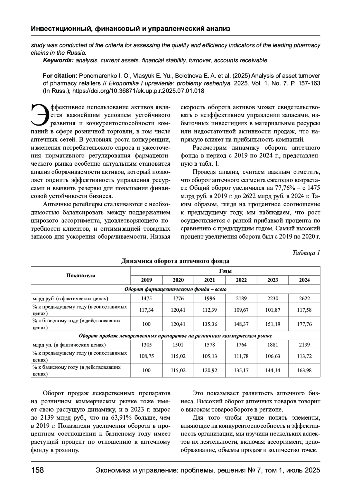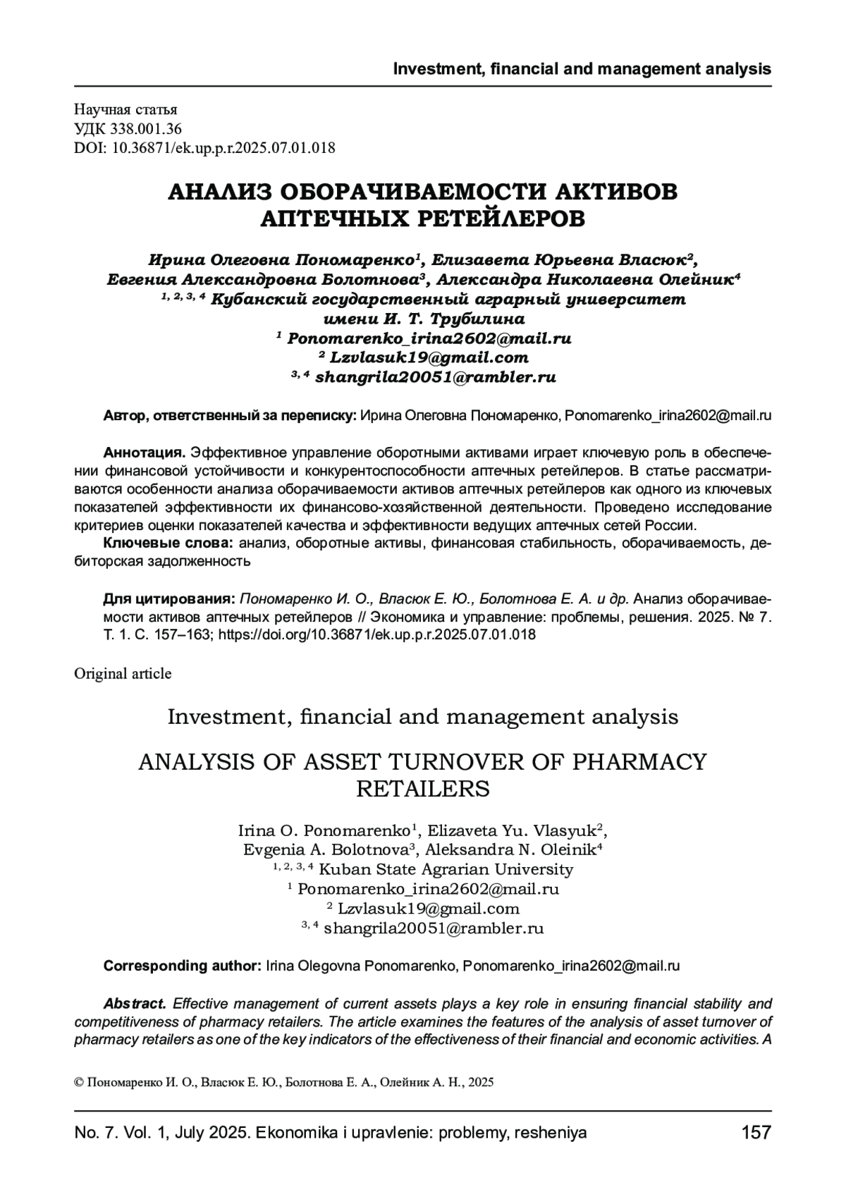 ПОНОМАРЕНКО И. О., ВЛАСЮК Е. Ю., БОЛОТНОВА Е. А., ОЛЕЙНИК А. Н. АНАЛИЗ ОБОРАЧИВАЕМОСТИ АКТИВОВ АПТЕЧНЫХ РЕТЕЙЛЕРОВ // ЭКОНОМИКА И УПРАВЛЕНИЕ: ПРОБЛЕМЫ, РЕШЕНИЯ. 2025. ТОМ 1 № 7