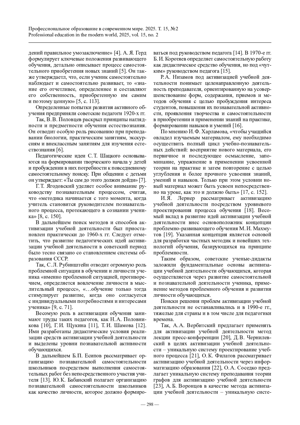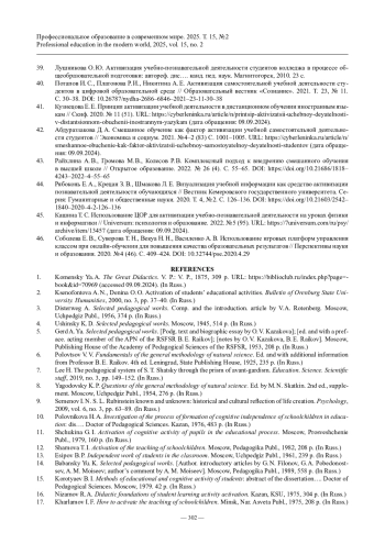 40. Потапов И.С., Платонова Р.И., Никитина А.Е. Активизация самостоятельной учебной деятельности студентов в цифровой образовательной среде // Образовательный вестник «Сознание». 2021. T. 23, № 11. С. 30-38. https://doi.org/10.26787/nydha-2686-6846-2021-23-11-30-38