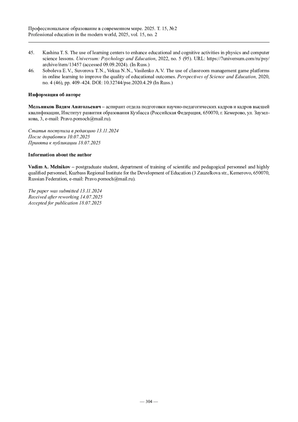 46. Соболева Е.В., Суворова Т.Н., Векуа Н.Н., Василенко А.В. Использование игровых платформ управления классом при онлайн-обучении для повышения качества образовательных результатов // Перспективы науки и образования. 2020. № 4 (46). С. 409-424. https://doi.org/10.32744/pse.2020.4.29