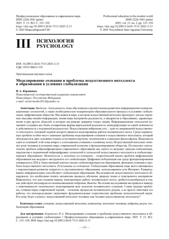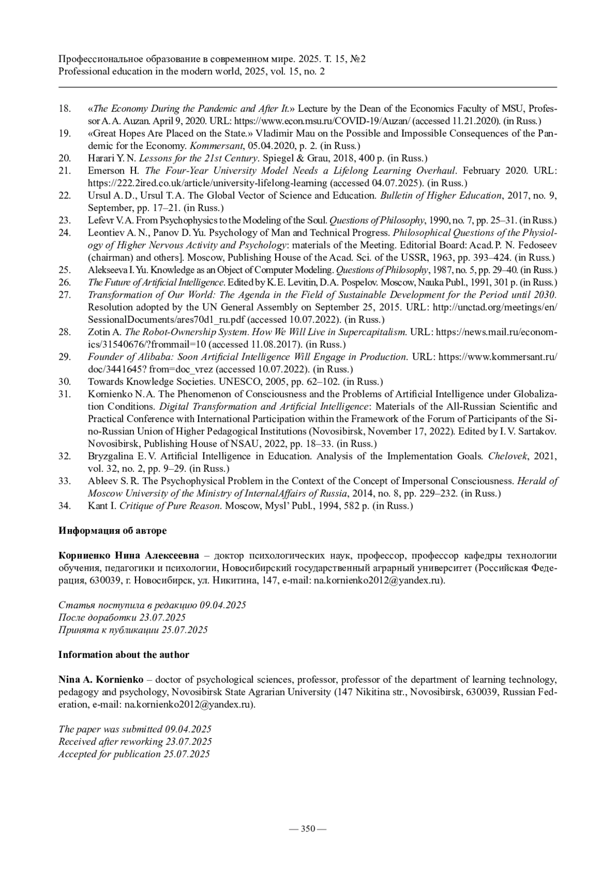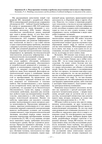 31. Корниенко Н.А. Феномен сознания и проблемы искусственного интеллекта в условиях глобализации // Цифровая трансформация и искусственный интеллект: материалы всероссийской научно-практической конференции с международным участием в рамках форума участников китайско-российского союза высших педагогических учебных заведений (г. Новосибирск, 17 ноября 2022) / под ред. И.В. Сартакова. Новосибирск: Изд-во НГПУ. 2022. С. 18-33.