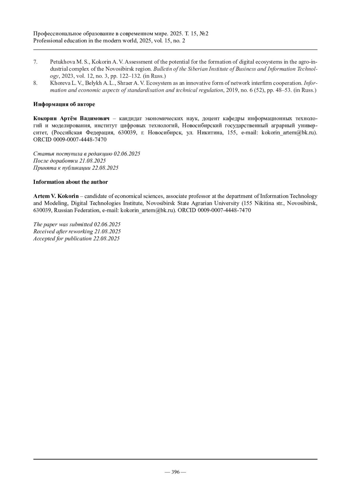 6. Петухова М.С., Кокорин А.В. Организационно-экономический механизм формирования и функционирования цифровой экосистемы в АПК региона // Вестник Сибирского института бизнеса и информационных технологий. 2024. Т. 13, № 1. С. 116-122.