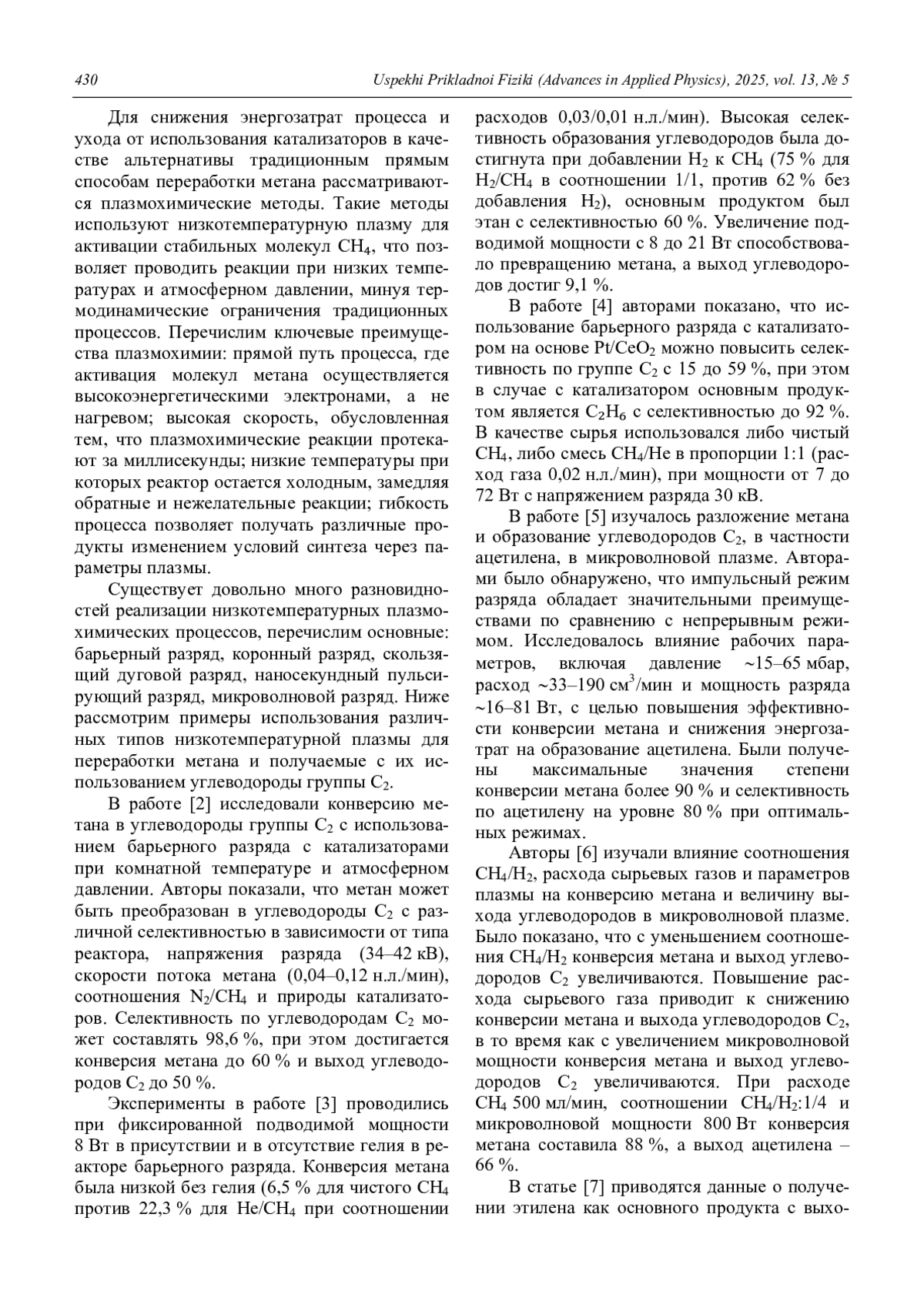 Представлены результаты конверсии метана в углеводороды группы С2 в холодной, химически активной, сверхзвуковой электронно-пучковой плазме. Получены зависимости коэффициента использования метана и выхода продуктов от энергии и тока активирующего пучка электронов, дополнительной электромагнитной мощности, а также фонового давления. Показано, что за счет изменения вышеуказанных параметров возможно изменение состава получаемых продуктов.