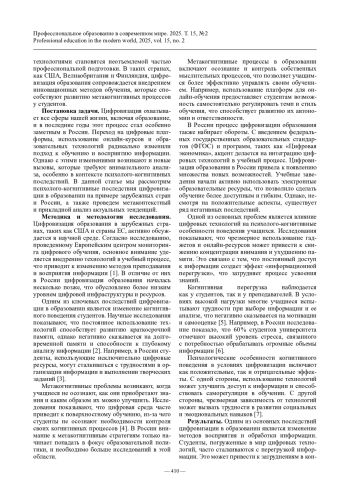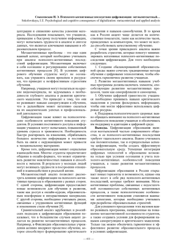 Психолого-когнитивные последствия цифровизации становятся все более актуальной темой для исследования в современном обществе. Последствия цифровизации не только затрагивают социальные и экономические аспекты, но и оказывают значительное влияние на когнитивное поведение индивидов. Метоконтекстный анализ когнитивного поведения позволяет выявить, как цифровые технологии изменяют восприятие информации, внимание и память. Важно понимать, что эти изменения могут и способствовать развитию новых навыков, и приводить к негативным последствиям, таким как снижение концентрации или ухудшение критического мышления. Таким образом, исследование психолого-когнитивных последствий цифровизации требует комплексного подхода и глубокого анализа.