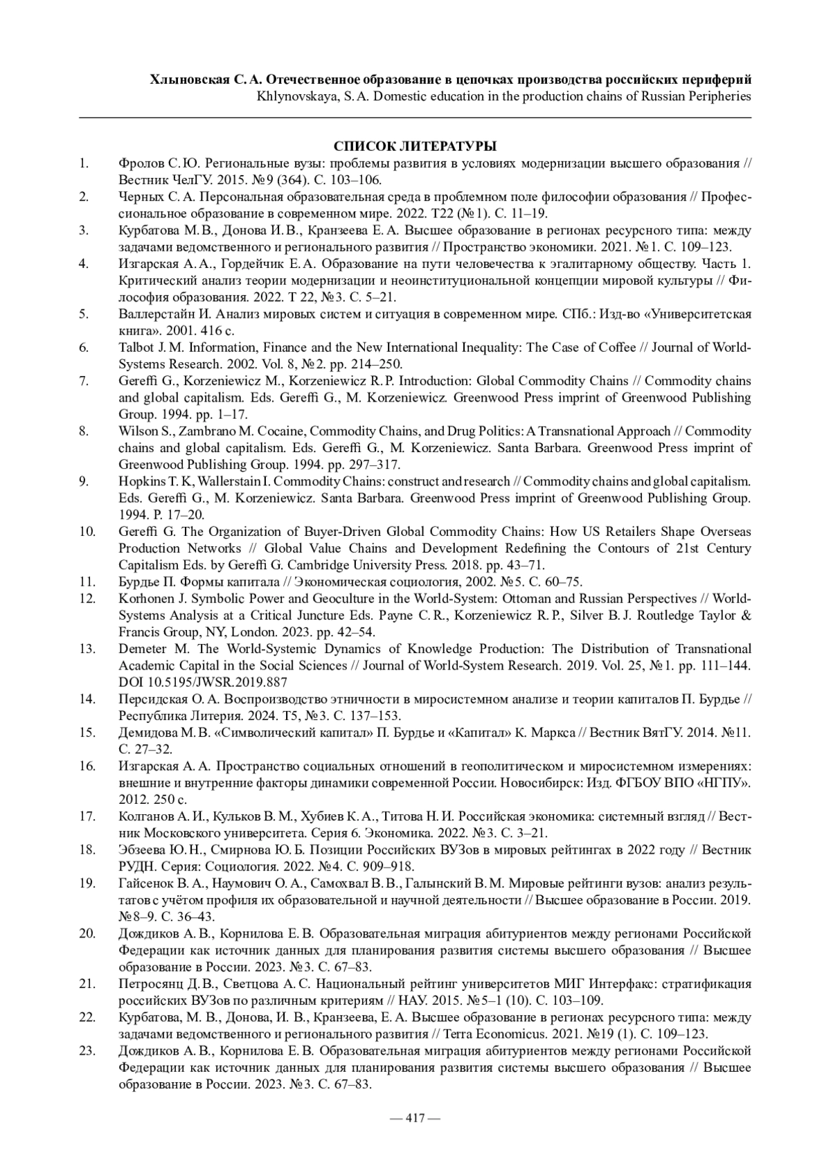 13. Demeter M. The World-Systemic Dynamics of Knowledge Production: The Distribution of Transnational Academic Capital in the Social Sciences // Journal of World-System Research. 2019. Vol. 25, № 1. pp. 111-144. https://doi.org/10.5195/JWSR.2019.887