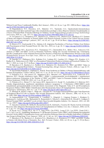 16. Ипполитова Л.И., Иванцова Е.Н., Кудлай Д.А., Паничев К.В., Кокорева С.П. TREC и KREC у новорожденных разного гестационного возраста // Молекуляр. медицина. 2023. Т. 21, No 3. С. 65-72. DOI: 10.29296/24999490-2023-03-09 EDN: JAGQVO