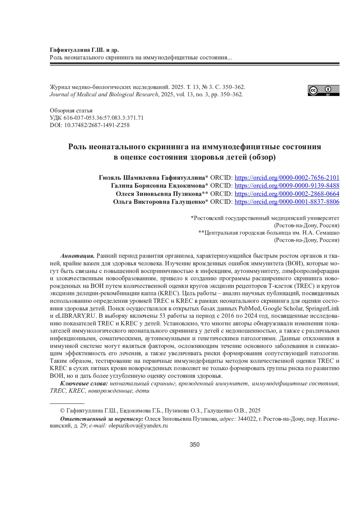 29. Барычева Л.Ю., Бачиева Л.И., Пучков А.А., Селезнева Ю.Г., Козьмова Н.А. Показатели TREC и KREC у пациентов с врожденными пороками сердца. Данные неонатального скрининга // Аллергология и иммунология в педиатрии. 2024. No 3 (78). С. 42-53. DOI: 10.53529/2500-1175-2024-3-42-53 EDN: OXQDCW