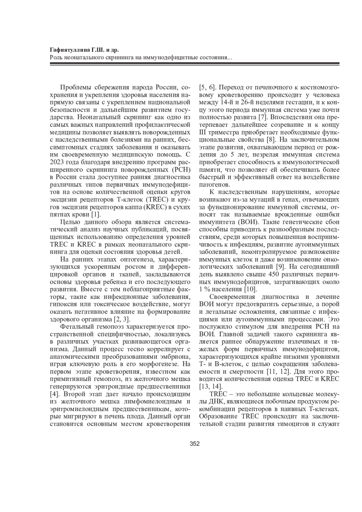 Ранний период развития организма, характеризующийся быстрым ростом органов и тканей, крайне важен для здоровья человека. Изучение врожденных ошибок иммунитета (ВОИ), которые могут быть связаны с повышенной восприимчивостью к инфекциям, аутоиммунитету, лимфопролиферации и злокачественным новообразованиям, привело к созданию программы расширенного скрининга новорожденных на ВОИ путем количественной оценки кругов эксцизии рецепторов Т-клеток (TREC) и кругов эксцизии делеции-рекомбинации каппа (KREC). Цель работы - анализ научных публикаций, посвященных использованию определения уровней TREC и KREC в рамках неонатального скрининга для оценки состояния здоровья детей. Поиск осуществлялся в открытых базах данных PubMed, Google Scholar, SpringerLink и eLIBRARY. RU. В выборку включены 53 работы за период с 2016 по 2024 год, посвященные исследованию показателей TREC и KREC у детей. Установлено, что многие авторы обнаруживали изменения показателей иммунологического неонатального скрининга у детей с недоношенностью, а также с различными инфекционными, соматическими, аутоиммунными и генетическими патологиями. Данные отклонения в иммунной системе могут являться фактором, осложняющим течение основного заболевания и снижающим эффективность его лечения, а также увеличивать риски формирования сопутствующей патологии. Таким образом, тестирование на первичные иммунодефициты методом количественной оценки TREC и KREC в сухих пятнах крови новорожденных позволяет не только формировать группы риска по развитию ВОИ, но и дать более углубленную оценку состояния здоровья.