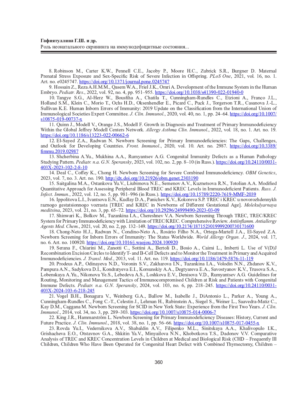 17. Shinwari K., Bolkov M., Tuzankina I.A., Chereshnev V.A. Newborn Screening Through TREC, TREC/KREC System for Primary Immunodeficiency with Limitation of TREC/KREC. Comprehensive Review // Antiinflamm. Antiallergy Agents Med. Chem. 2021. Vol. 20, No 2. P. 132-149. DOI: 10.2174/1871523019999200730171600 EDN: VKDLWX