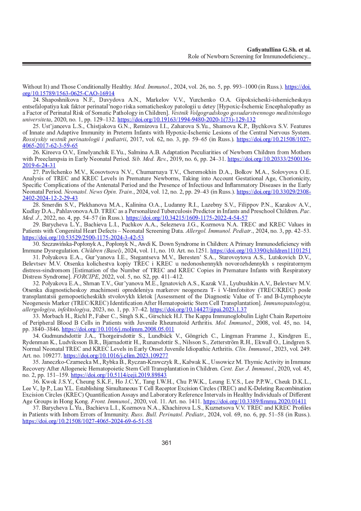 37. Барычева Л.Ю., Бачиева Л.И., Козьмова Н.А., Хачирова Л.С., Кузнецова В.В. Профили TREC и KREC у пациентов с врожденными дефектами иммунитета // Рос. вестн. перинатологии и педиатрии. 2024. Т. 69, No 6. С. 51-58. DOI: 10.21508/1027-4065-2024-69-6-51-58 EDN: JREUWZ