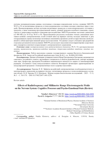 28. Zheng R., Zhang X., Gao Y., Gao D., Gong W., Zhang C., Dong G., Li Z. Biological Effects of Exposure to 2650 MHz Electromagnetic Radiation on the Behavior, Learning, and Memory of Mice // Brain Behav. 2023. Vol. 13, No 6. Art. No e3004. DOI: 10.1002/brb3.3004 EDN: WYTEXK