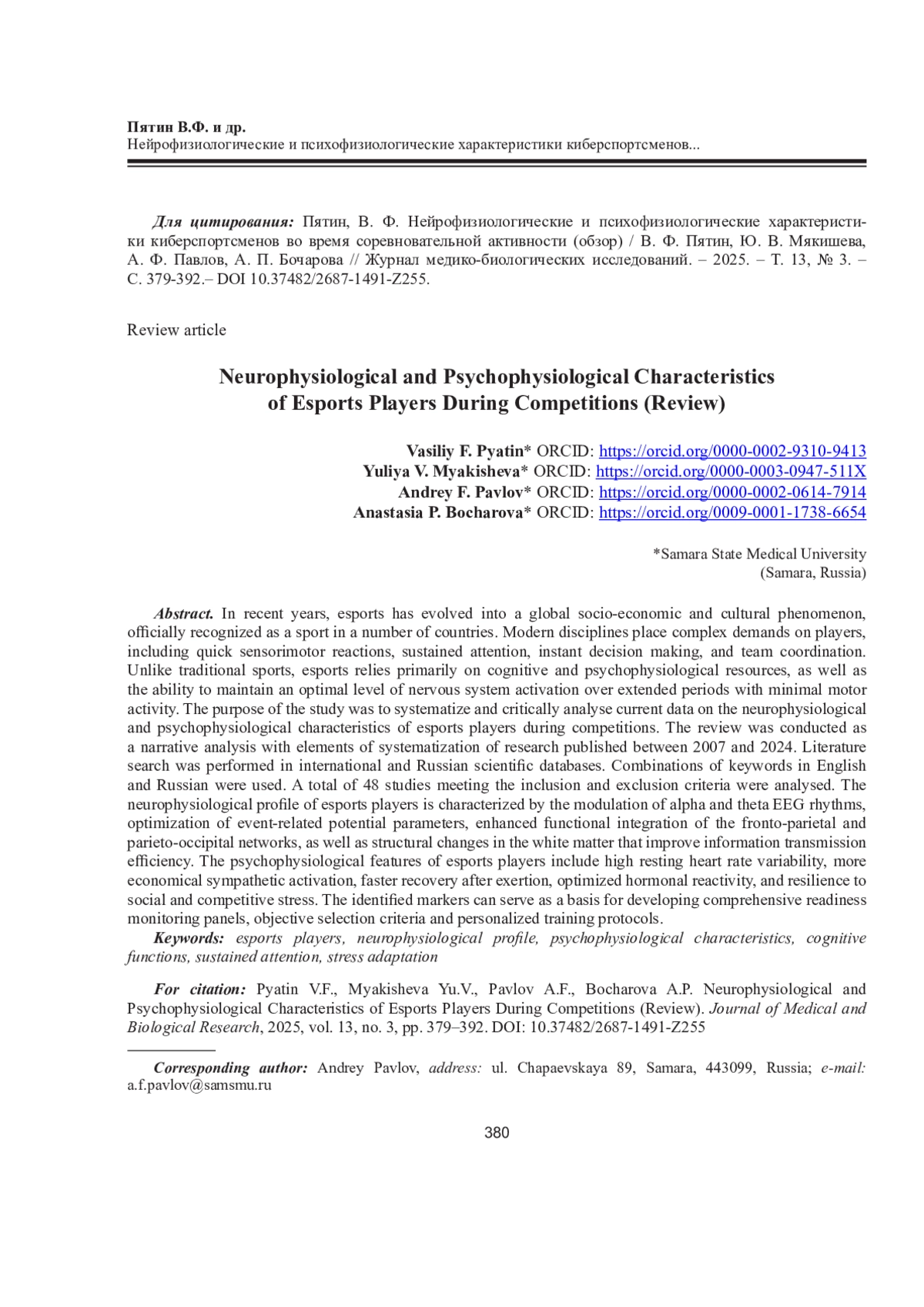 Киберспорт в последние годы превратился в глобальное социально-экономическое и культурное явление, признанное в ряде стран официальным видом спорта. Современные дисциплины предъявляют к игрокам комплексные требования, включающие высокую скорость сенсомоторных реакций, устойчивое внимание, мгновенное принятие решений и командную координацию. В отличие от традиционных видов спорта, в киберспорте ключевую роль играют когнитивные и психофизиологические ресурсы, а также способность к длительному поддержанию оптимального уровня активации нервной системы при минимальной моторной активности. Цель работы - обобщение и критический анализ современных данных о нейро- и психофизиологических особенностях киберспортсменов в соревновательной деятельности. Обзор выполнен в формате нарративного анализа с элементами систематизации исследований, опубликованных в период с 2007 по 2024 год. Поиск литературы проводился в международных и российских научных базах данных. Использовались комбинации ключевых слов на английском и русском языках. В обзор вошли 48 работ, которые были отобраны по заранее определенным критериям включения и исключения. Нейрофизиологический профиль киберспортсменов характеризуется модуляцией альфа- и тета-ритмов электроэнцефалограммы, оптимизацией параметров вызванных потенциалов, усиленной функциональной интеграцией фронто-париетальных и теменно-затылочных сетей, а также структурными изменениями белого вещества, повышающими эффективность передачи информации. Психофизиологические особенности включают высокую вариабельность сердечного ритма в покое, более экономичную симпатическую активацию, ускоренное восстановление после нагрузок, оптимизированную гормональную реактивность и устойчивость к социальным и соревновательным стрессам. Выявленные маркеры могут служить основой для разработки комплексных панелей мониторинга готовности, объективных критериев отбора и персонализированных тренировочных протоколов.
