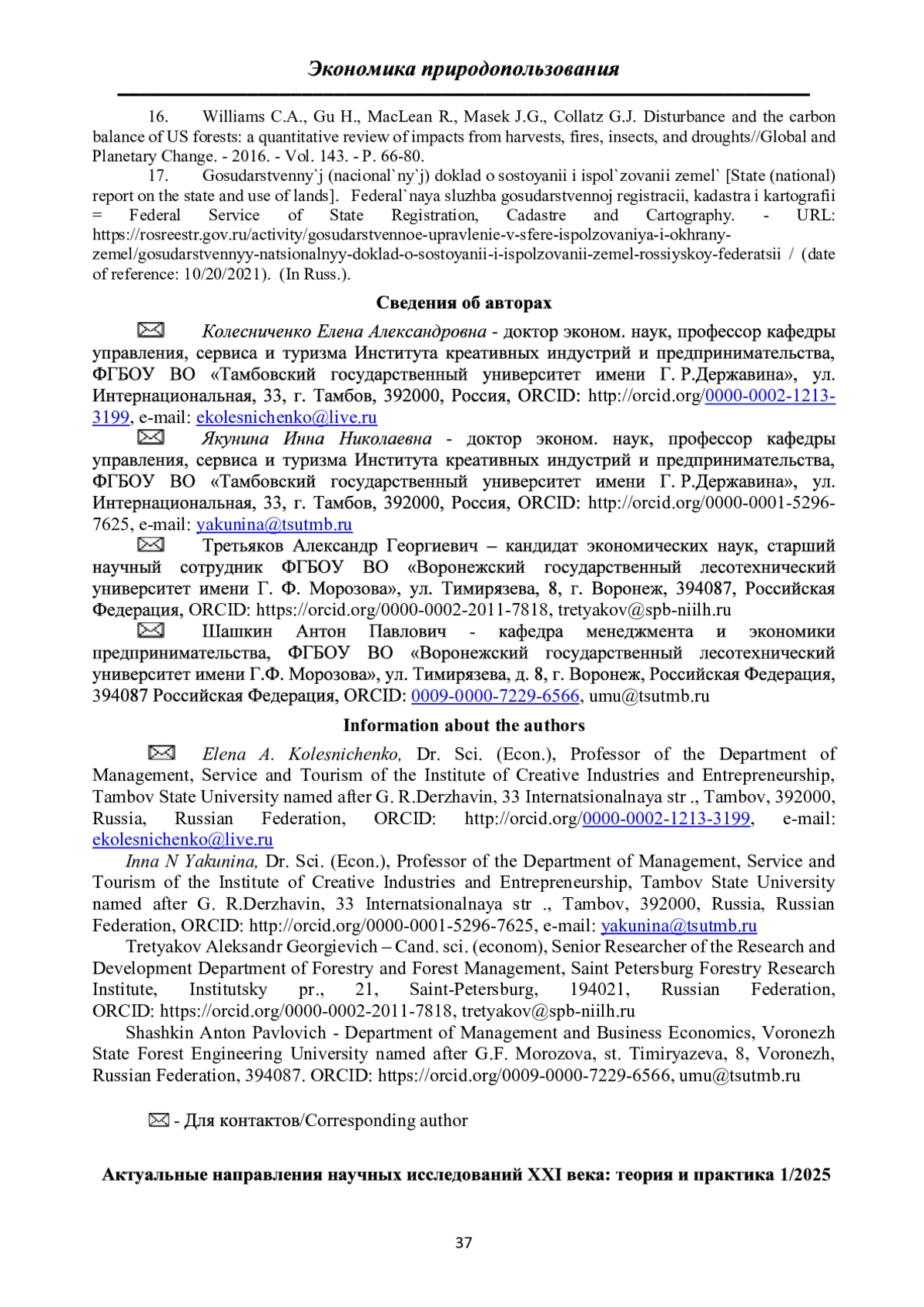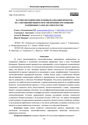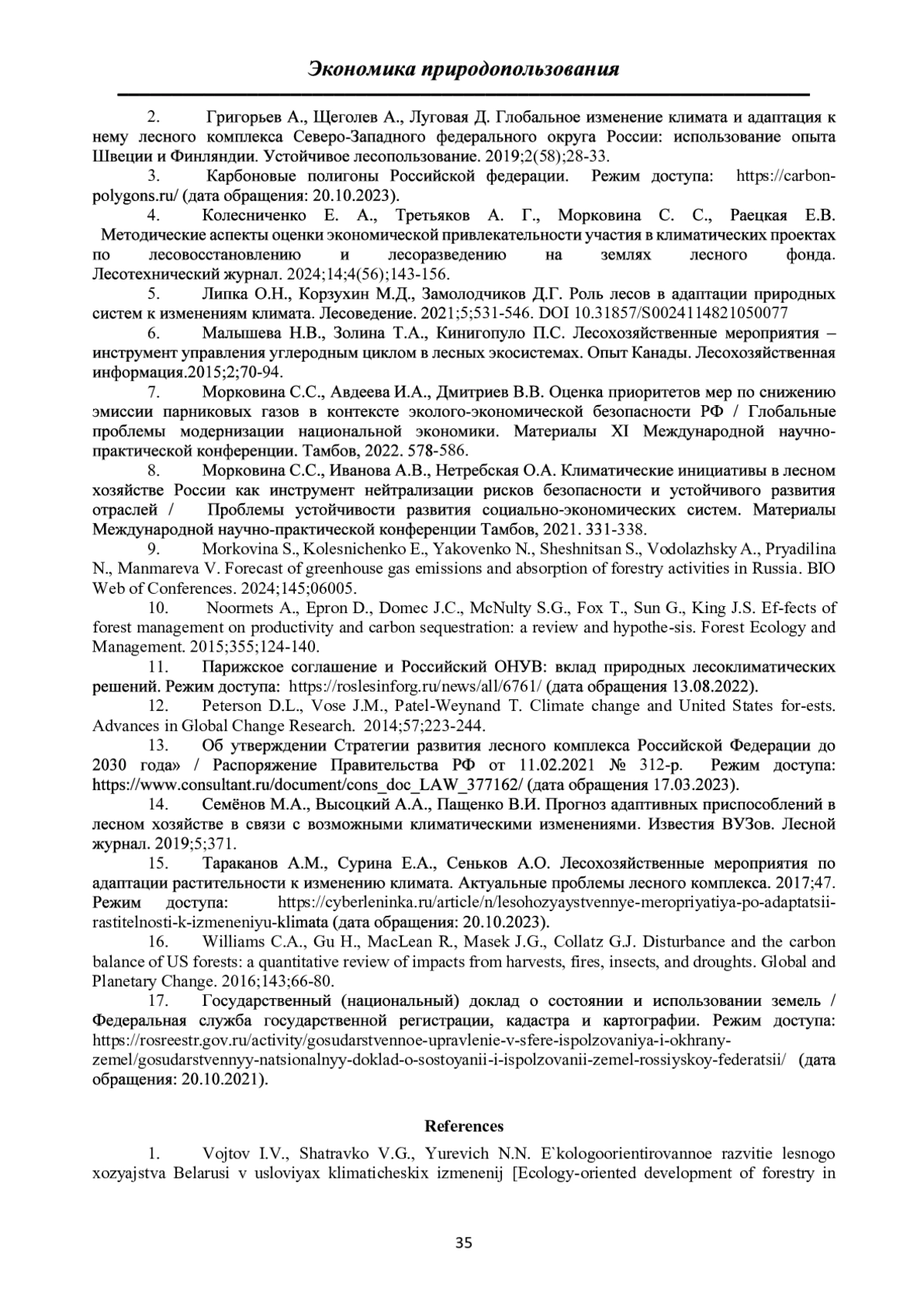 4. Колесниченко Е. А., Третьяков А. Г., Морковина С. С., Раецкая Е.В. Методические аспекты оценки экономической привлекательности участия в климатических проектах по лесовосстановлению и лесоразведению на землях лесного фонда. Лесотехнический журнал. 2024;14;4(56);143-156. EDN: JCGOTX