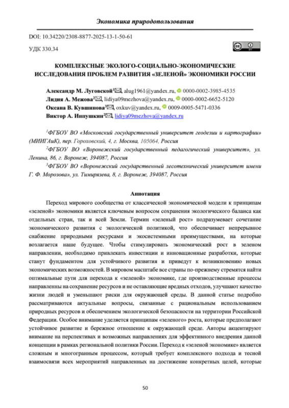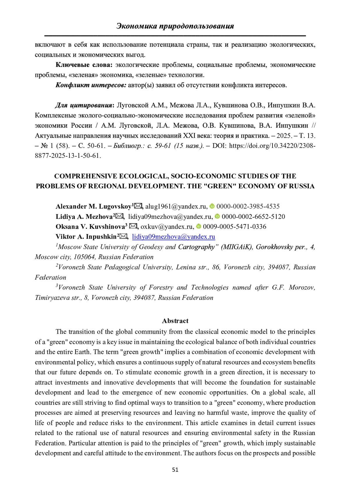 20. Zemzyulina V.Yu. On the relevance of the green economy for Russian enterprises / V.Yu. Zemzyulina, N.R. Kelchevskaya // Russian regions in the focus of change: Collection of reports of the XVII International Conference, Yekaterinburg, November 17-19, 2022. - Yekaterinburg: OOO Izdatelskiy Dom Azhur, 2023. - P. 283-286.