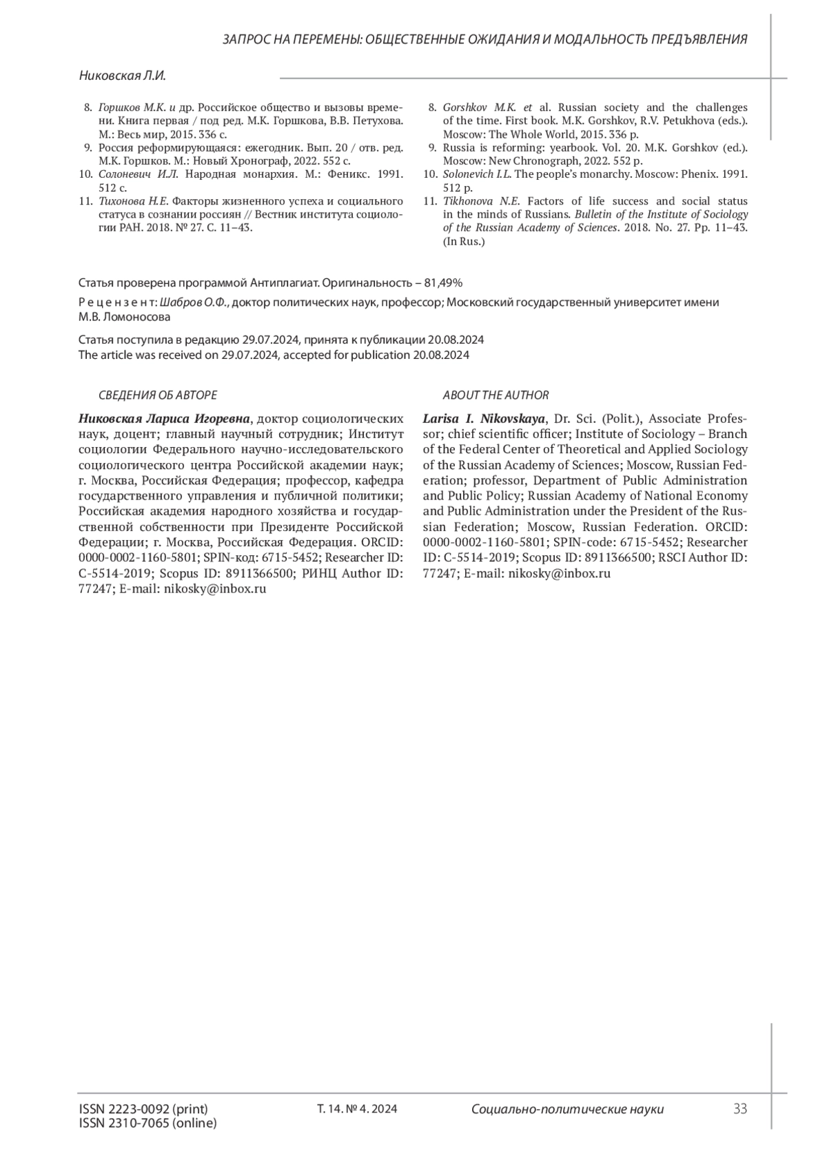 7. Петухов Р.В. Латов Ю,В. Что скрывается за запросом на перемены? // СОЦИС. Социальные исследования. 2022. № 2. С. 157-160. EDN: FWOAQQ