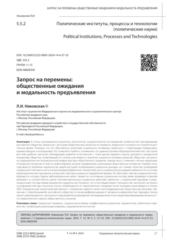 В статье анализируются результаты многолетних социологических исследований особенностей трансформации российского общества, связанные с растущим общественным запросом на перемены, модальность которого не снижается длительное время. Показано, что это обусловлено усилением социального активизма, связанного с «помогающим поведением», взаимопомощью и кооперацией. Это позволило прийти к пониманию, что административно-бюрократический класс выстроил для себя удобные «капсулы», блокирующие развитие естественной, с точки зрения здравого смысла, деловой и гражданской инициативы общества, позволяющей его членам участвовать в принятии социально-значимых решений. Общество настроено на оздоровление институциональной инфраструктуры общественного развития, прежде всего, снижение степени коррупции, отчуждения населения от власти, разблокировки каналов продвижения и реализации общественных интересов. Помимо этого, поднимается проблема недовольства людей растущей поляризацией социальных доходов, что снижает качество проводимой социальной политики в части улучшения демографических показателей, роста социальной восходящей мобильности на основе меритократических принципов, улучшения структуры социально-трудовой мотивации. Это обостряет чувство социальной справедливости, которое, будучи заблокированным, может привести к негативным социальным последствиям, формируя «горючий материал» и, соответственно, риски неконвенциональных социальных действий, связанных с социальными взрывами и революционными последствиями выражения недовольства Показано, что в настоящий момент большинство населения настроено на реформисткий лад, поскольку только освобождается от невротического синдрома после пандэмии короновируса и начала СВО. Определенный энергетический импульс к переменам задается также консолидированным общественным мнением, связанным с «перепрошивкой» российского общества по линии дифференциации от западных универсалистких подходов, поиска своего цивилизационно- культурного кода развития, возрождения неотрадиционалистских нарративов формирования ценностно-символического каркаса общественного сознания.