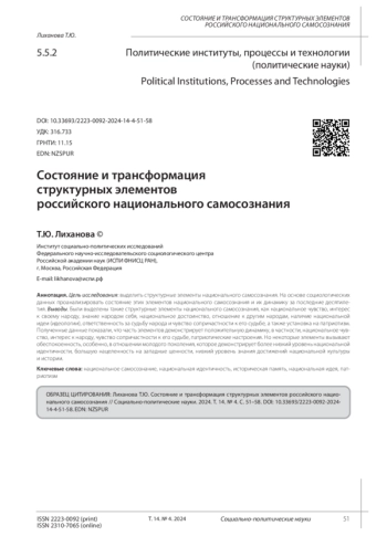 Цель исследования: выделить структурные элементы национального самосознания. На основе социологических данных проанализировать состояние этих элементов национального самосознания и их динамику за последние десятилетия. Выводы. Были выделены такие структурные элементы национального самосознания, как национальное чувство, интерес к своему народу, знание народом себя, национальное достоинство, отношение к другим народам, наличие национальной идеи (идеологии), ответственность за судьбу народа и чувство сопричастности к его судьбе, а также установка на патриотизм. Полученные данные показали, что часть элементов демонстрирует положительную динамику, в частности, национальное чувство, интерес к народу, чувство сопричастности к его судьбе, патриотические настроения. Но некоторые элементы вызывают обеспокоенность, особенно, в отношении молодого поколения, которое демонстрирует более низкий уровень национальной идентичности, большую нацеленность на западные ценности, низкий уровень знания достижений национальной культуры и истории.