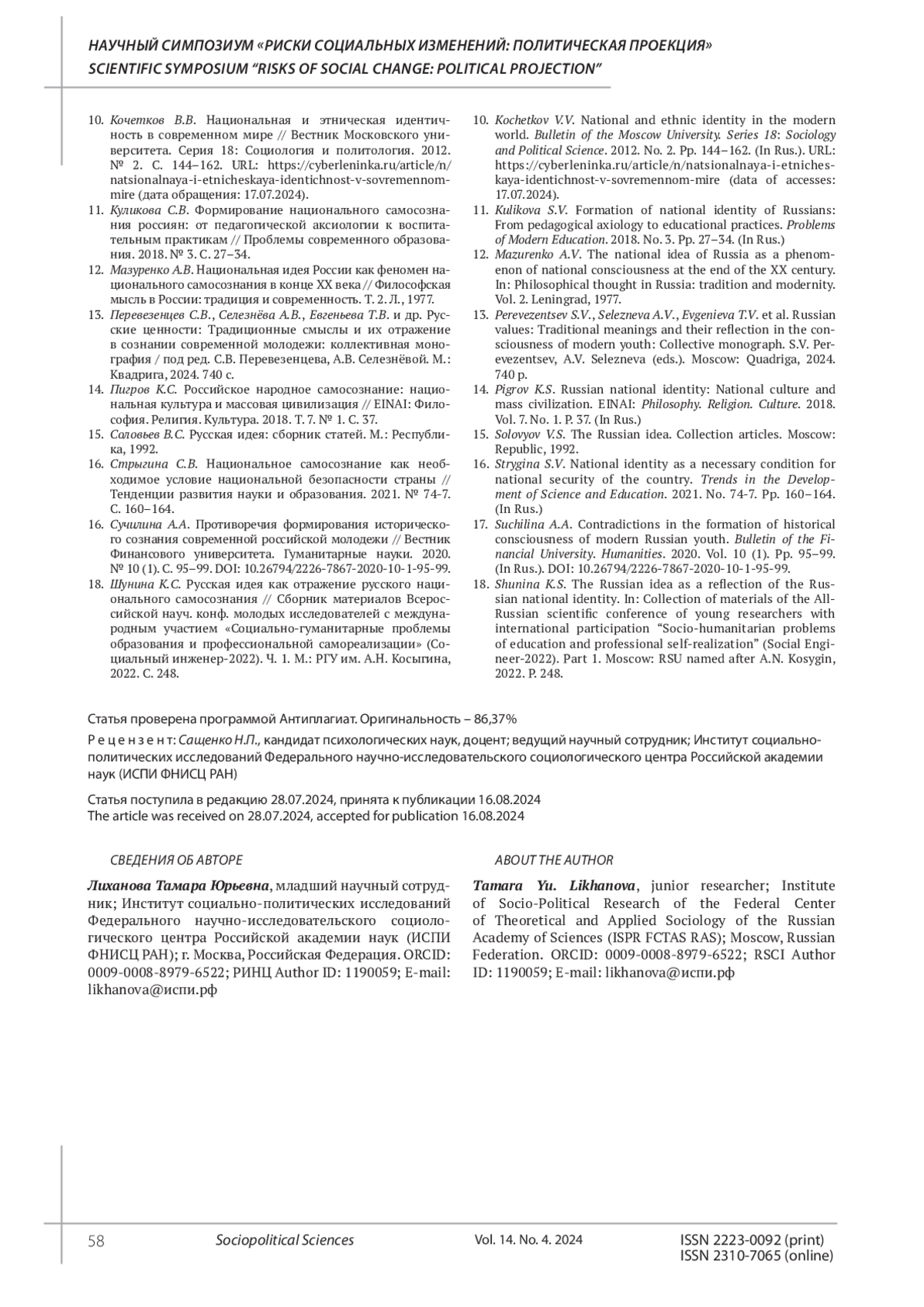 18. Шунина К.С. Русская идея как отражение русского национального самосознания // Сборник материалов Всероссийской науч. конф. молодых исследователей с международным участием “Социально-гуманитарные проблемы образования и профессиональной самореализации” (Социальный инженер-2022). Ч. 1. М.: РГУ им. А.Н. Косыгина, 2022. С. 248. EDN: KRXOEA